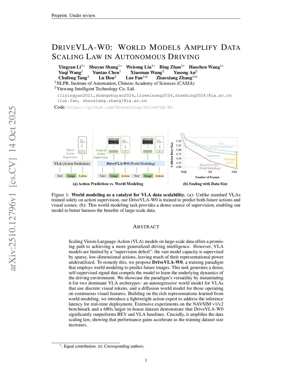 DriveVLA-W0: World Models Amplify Data Scaling Law in Autonomous Driving