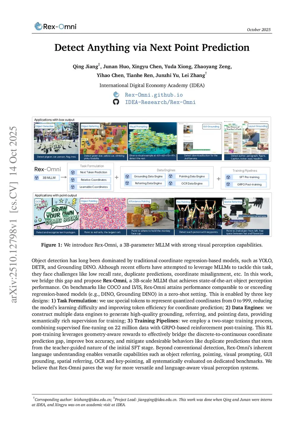 Object detection has long been dominated by traditional coordinate regression-based models, such as YOLO, DETR, and Grounding DINO. Although recent efforts have attempted to leverage MLLMs to tackle this task, they face challenges like low recall rate, duplicate predictions, coordinate misalignment, etc. In this work, we bridge this gap and propose Rex-Omni, a 3B-scale MLLM that achieves state-of-the-art object perception performance. On benchmarks like COCO and LVIS, Rex-Omni attains performance comparable to or exceeding regression-based models (e.g., DINO, Grounding DINO) in a zero-shot setting. This is enabled by three key designs: 1) Task Formulation: we use special tokens to represent quantized coordinates from 0 to 999, reducing the model's learning difficulty and improving token efficiency for coordinate prediction; 2) Data Engines: we construct multiple data engines to generate high-quality grounding, referring, and pointing data, providing semantically rich supervision for training; \3) Training Pipelines: we employ a two-stage training process, combining supervised fine-tuning on 22 million data with GRPO-based reinforcement post-training. This RL post-training leverages geometry-aware rewards to effectively bridge the discrete-to-continuous coordinate prediction gap, improve box accuracy, and mitigate undesirable behaviors like duplicate predictions that stem from the teacher-guided nature of the initial SFT stage. Beyond conventional detection, Rex-Omni's inherent language understanding enables versatile capabilities such as object referring, pointing, visual prompting, GUI grounding, spatial referring, OCR and key-pointing, all systematically evaluated on dedicated benchmarks. We believe that Rex-Omni paves the way for more versatile and language-aware visual perception systems.
