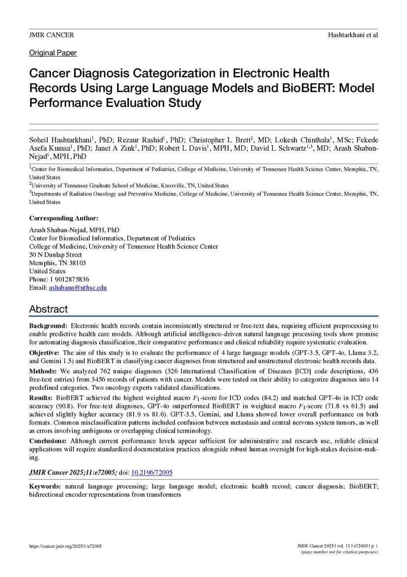 Electronic health records contain inconsistently structured or free-text data, requiring efficient preprocessing to enable predictive health care models. Although artificial intelligence-driven natural language processing tools show promise for automating diagnosis classification, their comparative performance and clinical reliability require systematic evaluation. The aim of this study is to evaluate the performance of 4 large language models (GPT-3.5, GPT-4o, Llama 3.2, and Gemini 1.5) and BioBERT in classifying cancer diagnoses from structured and unstructured electronic health records data. We analyzed 762 unique diagnoses (326 International Classification of Diseases (ICD) code descriptions, 436free-text entries) from 3456 records of patients with cancer. Models were tested on their ability to categorize diagnoses into 14predefined categories. Two oncology experts validated classifications. BioBERT achieved the highest weighted macro F1-score for ICD codes (84.2) and matched GPT-4o in ICD code accuracy (90.8). For free-text diagnoses, GPT-4o outperformed BioBERT in weighted macro F1-score (71.8 vs 61.5) and achieved slightly higher accuracy (81.9 vs 81.6). GPT-3.5, Gemini, and Llama showed lower overall performance on both formats. Common misclassification patterns included confusion between metastasis and central nervous system tumors, as well as errors involving ambiguous or overlapping clinical terminology. Although current performance levels appear sufficient for administrative and research use, reliable clinical applications will require standardized documentation practices alongside robust human oversight for high-stakes decision-making.