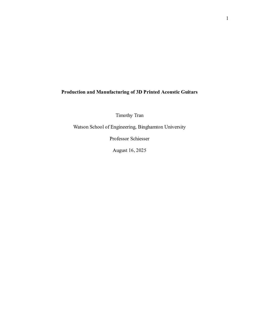 This research investigates the feasibility of producing affordable, functional acoustic guitars using 3D printing, with a focus on producing structural designs with proper tonal performance. Conducted in collaboration with William Schiesser, the study uses a classical guitar model, chosen for its lower string tension, to evaluate the tonal characteristics of a 3D-printed prototype made from polylactic acid (PLA). Due to the build plate size constraints of the Prusa Mark 4 printer, the guitar body was divided into multiple sections joined with press-fit tolerances and minimal cyanoacrylate adhesive. CAD modeling in Fusion 360 ensured dimensional accuracy in press-fit connections and the overall assembly. Following assembly, the guitar was strung with nylon strings and tested using Audacity software to compare recorded frequencies and notes with standard reference values. Results showed large deviations in lower string frequencies, likely caused by the material choice utilized in printing. Accurate pitches were reached with all strings despite frequency differences through tuning, demonstrating that PLA and modern manufacturing methods can produce affordable, playable acoustic guitars despite inevitable challenges. Further research may investigate alternative plastics for superior frequency matching. This approach holds significant potential for expanding access to quality instruments while reducing reliance on endangered tonewoods, thereby encouraging both sustainable instrument production and increased musical participation. This also creates opportunities for disadvantaged communities where access to musical instruments remains a challenge.Keywords: Luthiery, Stereolithography, 3D-Print, Guitar Making