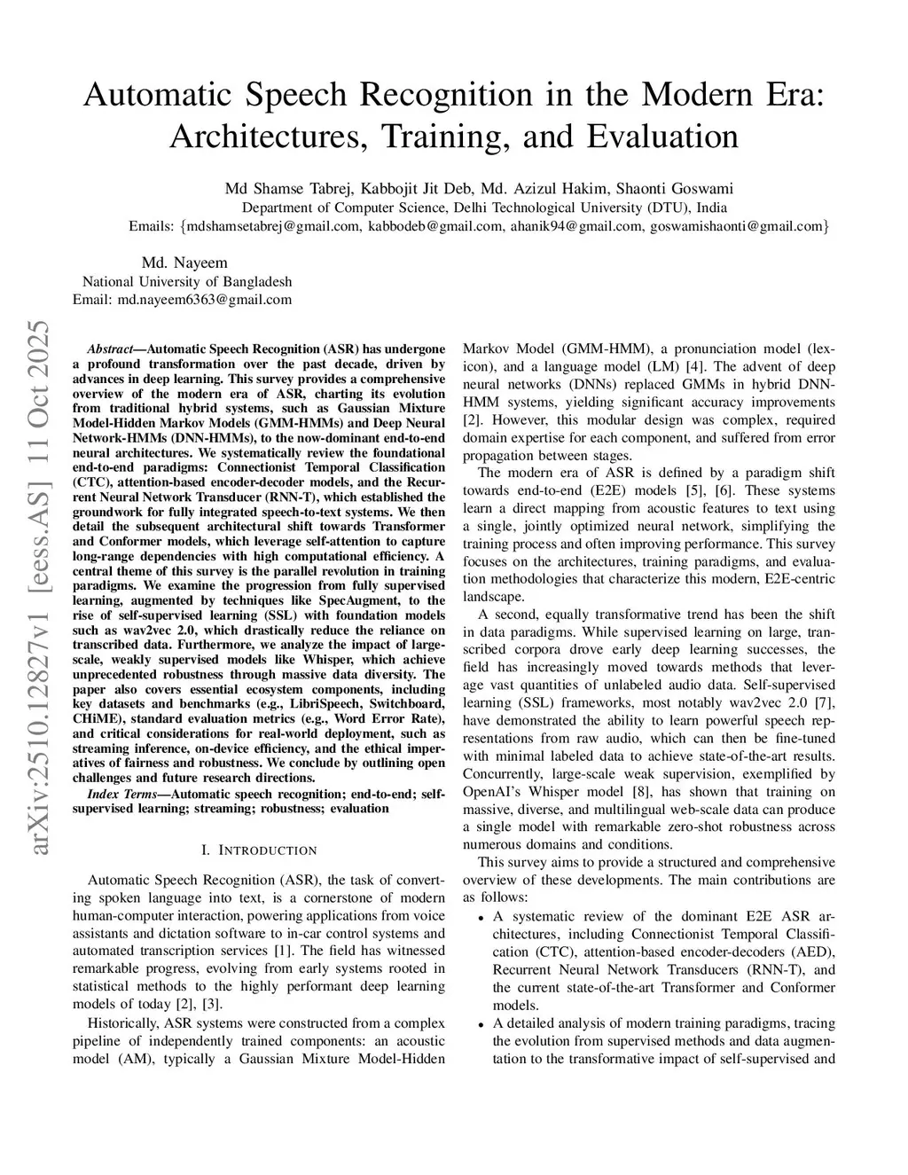 Automatic Speech Recognition (ASR) has undergone a profound transformation over the past decade, driven by advances in deep learning. This survey provides a comprehensive overview of the modern era of ASR, charting its evolution from traditional hybrid systems, such as Gaussian Mixture Model-Hidden Markov Models (GMM-HMMs) and Deep Neural Network-HMMs (DNN-HMMs), to the now-dominant end-to-end neural architectures. We systematically review the foundational end-to-end paradigms: Connectionist Temporal Classification (CTC), attention-based encoder-decoder models, and the Recurrent Neural Network Transducer (RNN-T), which established the groundwork for fully integrated speech-to-text systems. We then detail the subsequent architectural shift towards Transformer and Conformer models, which leverage self-attention to capture long-range dependencies with high computational efficiency. A central theme of this survey is the parallel revolution in training paradigms. We examine the progression from fully supervised learning, augmented by techniques like SpecAugment, to the rise of self-supervised learning (SSL) with foundation models such as wav2vec 2.0, which drastically reduce the reliance on transcribed data. Furthermore, we analyze the impact of largescale, weakly supervised models like Whisper, which achieve unprecedented robustness through massive data diversity. The paper also covers essential ecosystem components, including key datasets and benchmarks (e.g., LibriSpeech, Switchboard, CHiME), standard evaluation metrics (e.g., Word Error Rate), and critical considerations for real-world deployment, such as streaming inference, on-device efficiency, and the ethical imperatives of fairness and robustness. We conclude by outlining open challenges and future research directions.