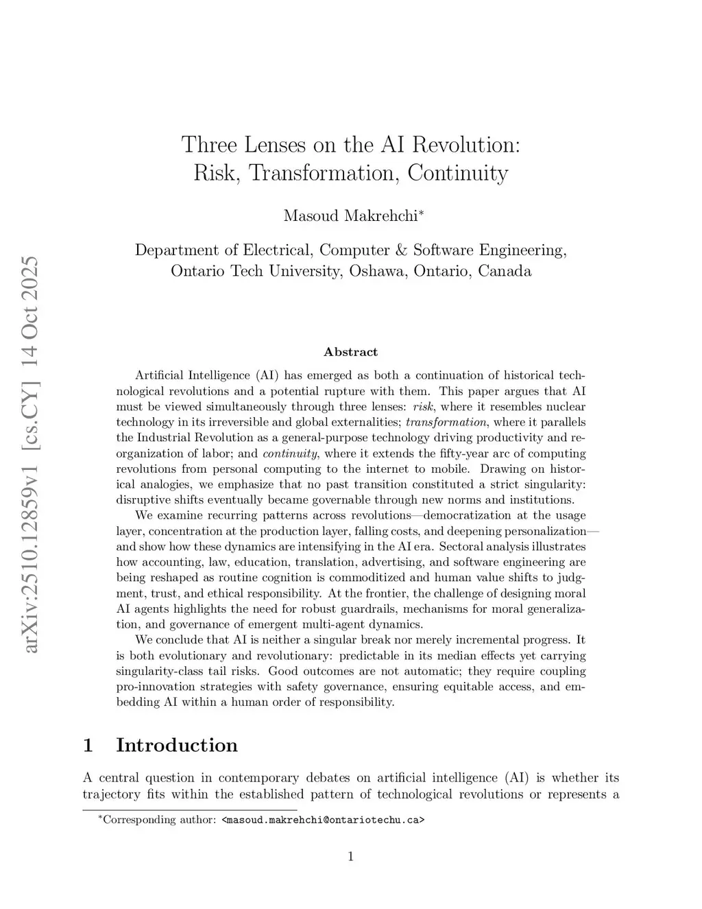 Artificial Intelligence (AI) has emerged as both a continuation of historical technological revolutions and a potential rupture with them. This paper argues that AI must be viewed simultaneously through three lenses: \textit{risk}, where it resembles nuclear technology in its irreversible and global externalities; \textit{transformation}, where it parallels the Industrial Revolution as a general-purpose technology driving productivity and reorganization of labor; and \textit{continuity}, where it extends the fifty-year arc of computing revolutions from personal computing to the internet to mobile. Drawing on historical analogies, we emphasize that no past transition constituted a strict singularity: disruptive shifts eventually became governable through new norms and institutions.We examine recurring patterns across revolutions -- democratization at the usage layer, concentration at the production layer, falling costs, and deepening personalization -- and show how these dynamics are intensifying in the AI era. Sectoral analysis illustrates how accounting, law, education, translation, advertising, and software engineering are being reshaped as routine cognition is commoditized and human value shifts to judgment, trust, and ethical responsibility. At the frontier, the challenge of designing moral AI agents highlights the need for robust guardrails, mechanisms for moral generalization, and governance of emergent multi-agent dynamics.We conclude that AI is neither a singular break nor merely incremental progress. It is both evolutionary and revolutionary: predictable in its median effects yet carrying singularity-class tail risks. Good outcomes are not automatic; they require coupling pro-innovation strategies with safety governance, ensuring equitable access, and embedding AI within a human order of responsibility.