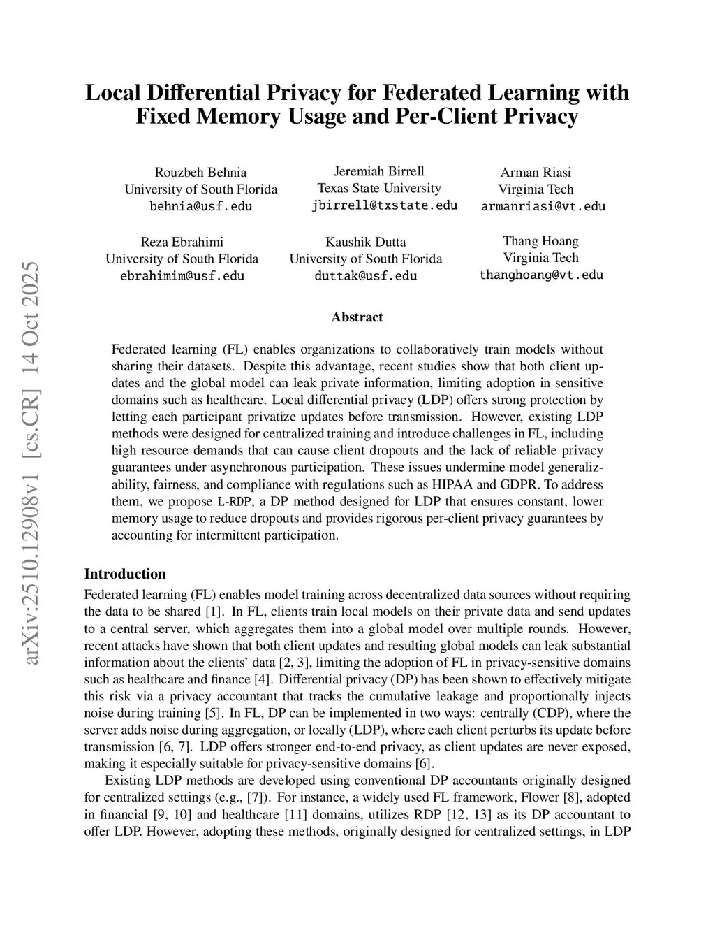 Federated learning (FL) enables organizations to collaboratively train models without sharing their datasets. Despite this advantage, recent studies show that both client updates and the global model can leak private information, limiting adoption in sensitive domains such as healthcare. Local differential privacy (LDP) offers strong protection by letting each participant privatize updates before transmission. However, existing LDP methods were designed for centralized training and introduce challenges in FL, including high resource demands that can cause client dropouts and the lack of reliable privacy guarantees under asynchronous participation. These issues undermine model generalizability, fairness, and compliance with regulations such as HIPAA and GDPR. To address them, we propose L-RDP, a DP method designed for LDP that ensures constant, lower memory usage to reduce dropouts and provides rigorous per-client privacy guarantees by accounting for intermittent participation.