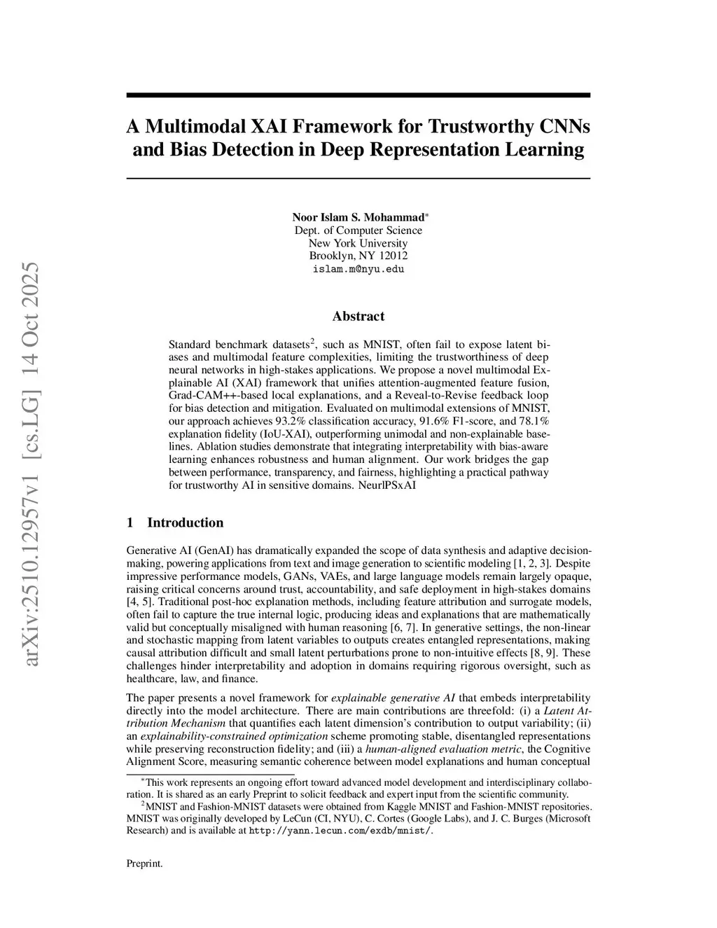 Standard benchmark datasets, such as MNIST, often fail to expose latent biases and multimodal feature complexities, limiting the trustworthiness of deep neural networks in high-stakes applications. We propose a novel multimodal Explainable AI (XAI) framework that unifies attention-augmented feature fusion, Grad-CAM++-based local explanations, and a Reveal-to-Revise feedback loop for bias detection and mitigation. Evaluated on multimodal extensions of MNIST, our approach achieves 93.2% classification accuracy, 91.6% F1-score, and 78.1% explanation fidelity (IoU-XAI), outperforming unimodal and non-explainable baselines. Ablation studies demonstrate that integrating interpretability with bias-aware learning enhances robustness and human alignment. Our work bridges the gap between performance, transparency, and fairness, highlighting a practical pathway for trustworthy AI in sensitive domains.