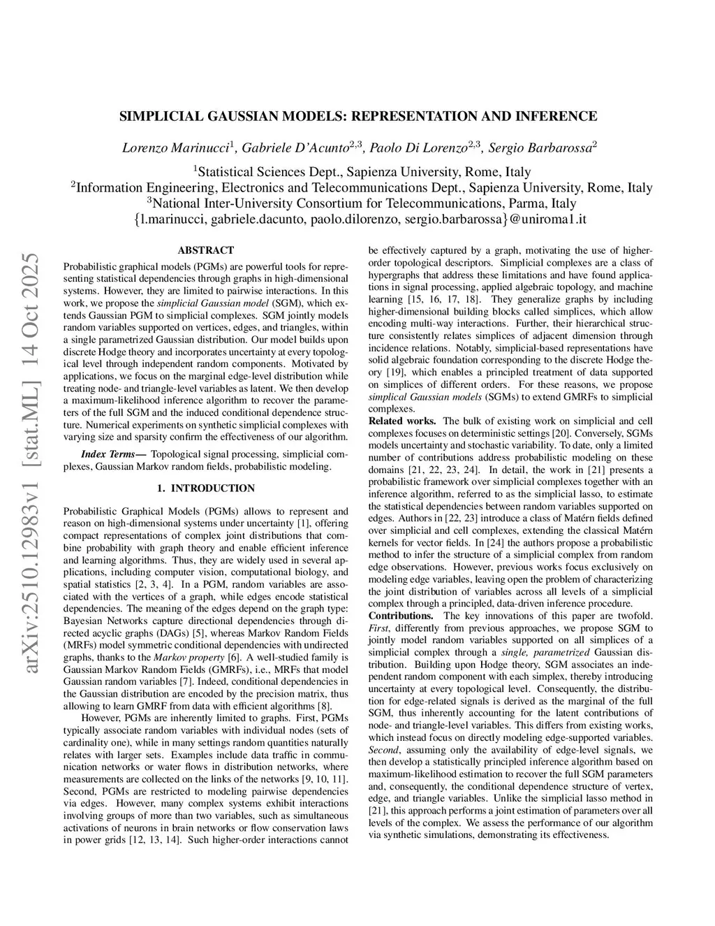 Probabilistic graphical models (PGMs) are powerful tools for representing statistical dependencies through graphs in high-dimensional systems. However, they are limited to pairwise interactions. In this work, we propose the simplicial Gaussian model (SGM), which extends Gaussian PGM to simplicial complexes. SGM jointly models random variables supported on vertices, edges, and triangles, within a single parametrized Gaussian distribution. Our model builds upon discrete Hodge theory and incorporates uncertainty at every topological level through independent random components. Motivated by applications, we focus on the marginal edge-level distribution while treating node- and triangle-level variables as latent. We then develop a maximum-likelihood inference algorithm to recover the parameters of the full SGM and the induced conditional dependence structure. Numerical experiments on synthetic simplicial complexes with varying size and sparsity confirm the effectiveness of our algorithm.