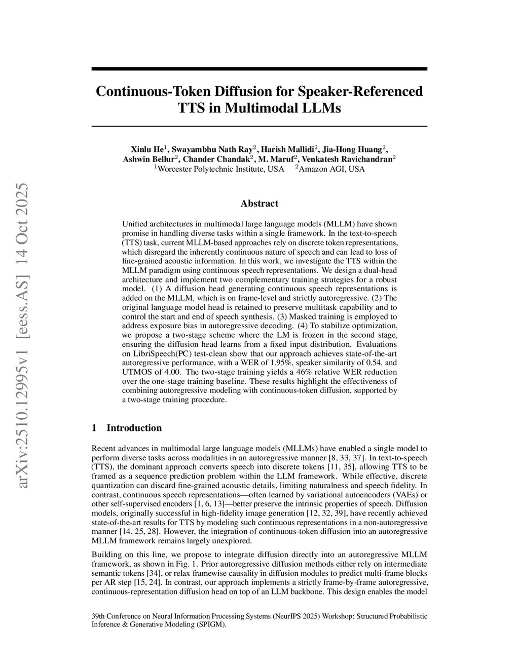 Continuous-Token Diffusion for Speaker-Referenced TTS in Multimodal LLMs