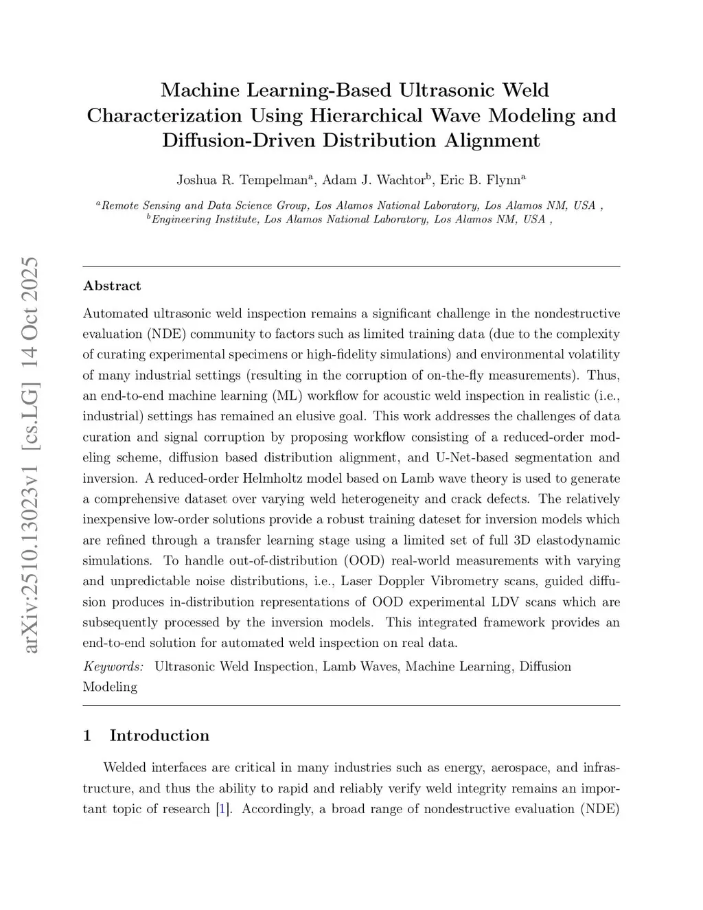 Automated ultrasonic weld inspection remains a significant challenge in the nondestructive evaluation (NDE) community to factors such as limited training data (due to the complexity of curating experimental specimens or high-fidelity simulations) and environmental volatility of many industrial settings (resulting in the corruption of on-the-fly measurements). Thus, an end-to-end machine learning (ML) workflow for acoustic weld inspection in realistic (i.e., industrial) settings has remained an elusive goal. This work addresses the challenges of data curation and signal corruption by proposing workflow consisting of a reduced-order modeling scheme, diffusion based distribution alignment, and U-Net-based segmentation and inversion. A reduced-order Helmholtz model based on Lamb wave theory is used to generate a comprehensive dataset over varying weld heterogeneity and crack defects. The relatively inexpensive low-order solutions provide a robust training dateset for inversion models which are refined through a transfer learning stage using a limited set of full 3D elastodynamic simulations. To handle out-of-distribution (OOD) real-world measurements with varying and unpredictable noise distributions, i.e., Laser Doppler Vibrometry scans, guided diffusion produces in-distribution representations of OOD experimental LDV scans which are subsequently processed by the inversion models. This integrated framework provides an end-to-end solution for automated weld inspection on real data.