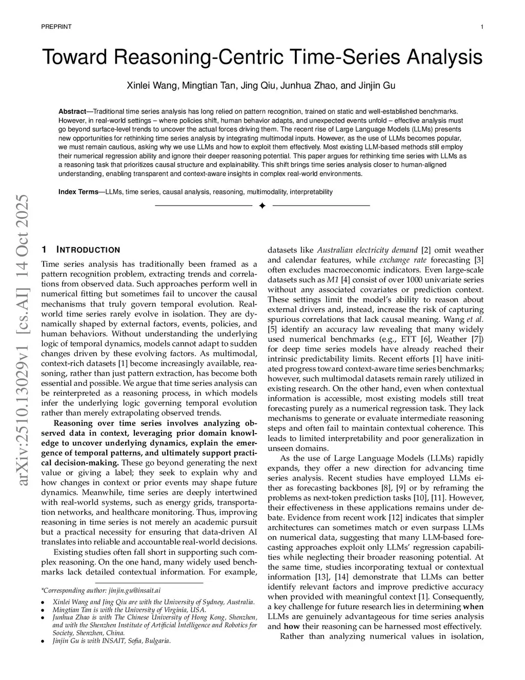 Traditional time series analysis has long relied on pattern recognition, trained on static and well-established benchmarks. However, in real-world settings -- where policies shift, human behavior adapts, and unexpected events unfold -- effective analysis must go beyond surface-level trends to uncover the actual forces driving them. The recent rise of Large Language Models (LLMs) presents new opportunities for rethinking time series analysis by integrating multimodal inputs. However, as the use of LLMs becomes popular, we must remain cautious, asking why we use LLMs and how to exploit them effectively. Most existing LLM-based methods still employ their numerical regression ability and ignore their deeper reasoning potential. This paper argues for rethinking time series with LLMs as a reasoning task that prioritizes causal structure and explainability. This shift brings time series analysis closer to human-aligned understanding, enabling transparent and context-aware insights in complex real-world environments.