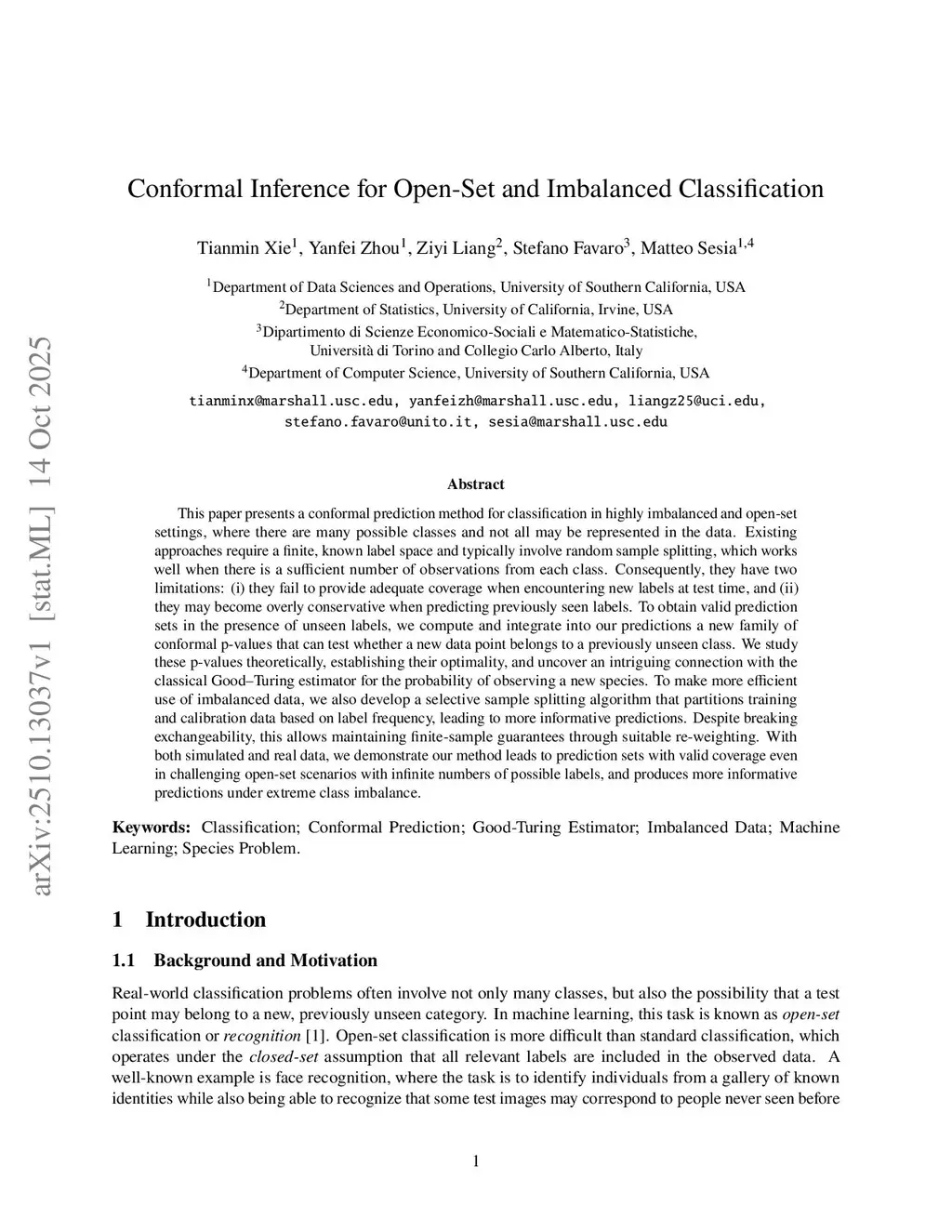This paper presents a conformal prediction method for classification in highly imbalanced and open-set settings, where there are many possible classes and not all may be represented in the data. Existing approaches require a finite, known label space and typically involve random sample splitting, which works well when there is a sufficient number of observations from each class. Consequently, they have two limitations: (i) they fail to provide adequate coverage when encountering new labels at test time, and (ii) they may become overly conservative when predicting previously seen labels. To obtain valid prediction sets in the presence of unseen labels, we compute and integrate into our predictions a new family of conformal p-values that can test whether a new data point belongs to a previously unseen class. We study these p-values theoretically, establishing their optimality, and uncover an intriguing connection with the classical Good--Turing estimator for the probability of observing a new species. To make more efficient use of imbalanced data, we also develop a selective sample splitting algorithm that partitions training and calibration data based on label frequency, leading to more informative predictions. Despite breaking exchangeability, this allows maintaining finite-sample guarantees through suitable re-weighting. With both simulated and real data, we demonstrate our method leads to prediction sets with valid coverage even in challenging open-set scenarios with infinite numbers of possible labels, and produces more informative predictions under extreme class imbalance.
