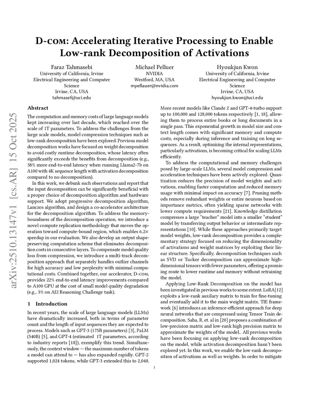 D-com: Accelerating Iterative Processing to Enable Low-rank Decomposition of Activations