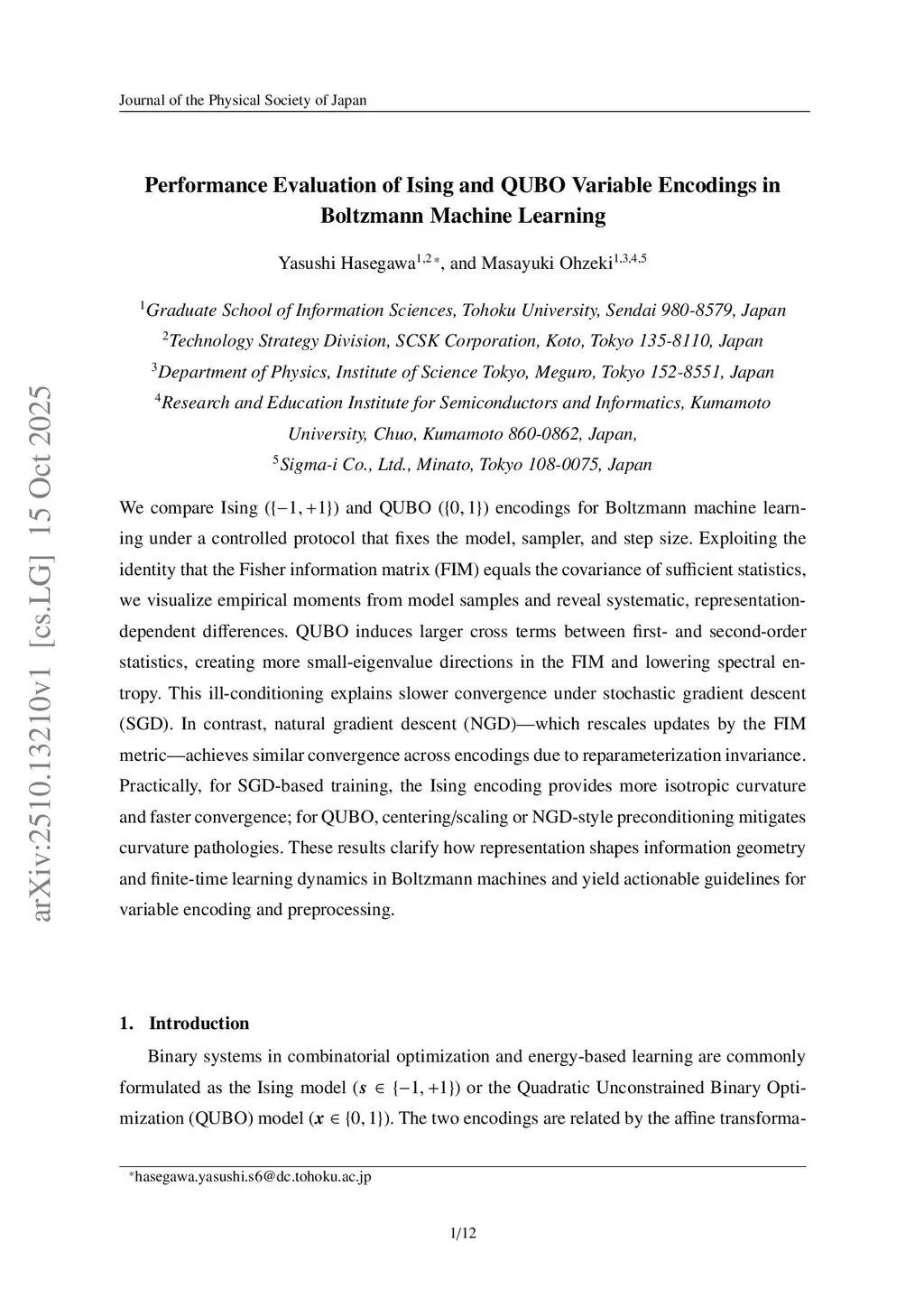 We compare Ising ({-1,+1}) and QUBO ({0,1}) encodings for Boltzmann machine learning under a controlled protocol that fixes the model, sampler, and step size. Exploiting the identity that the Fisher information matrix (FIM) equals the covariance of sufficient statistics, we visualize empirical moments from model samples and reveal systematic, representation-dependent differences. QUBO induces larger cross terms between first- and second-order statistics, creating more small-eigenvalue directions in the FIM and lowering spectral entropy. This ill-conditioning explains slower convergence under stochastic gradient descent (SGD). In contrast, natural gradient descent (NGD)-which rescales updates by the FIM metric-achieves similar convergence across encodings due to reparameterization invariance. Practically, for SGD-based training, the Ising encoding provides more isotropic curvature and faster convergence; for QUBO, centering/scaling or NGD-style preconditioning mitigates curvature pathologies. These results clarify how representation shapes information geometry and finite-time learning dynamics in Boltzmann machines and yield actionable guidelines for variable encoding and preprocessing.