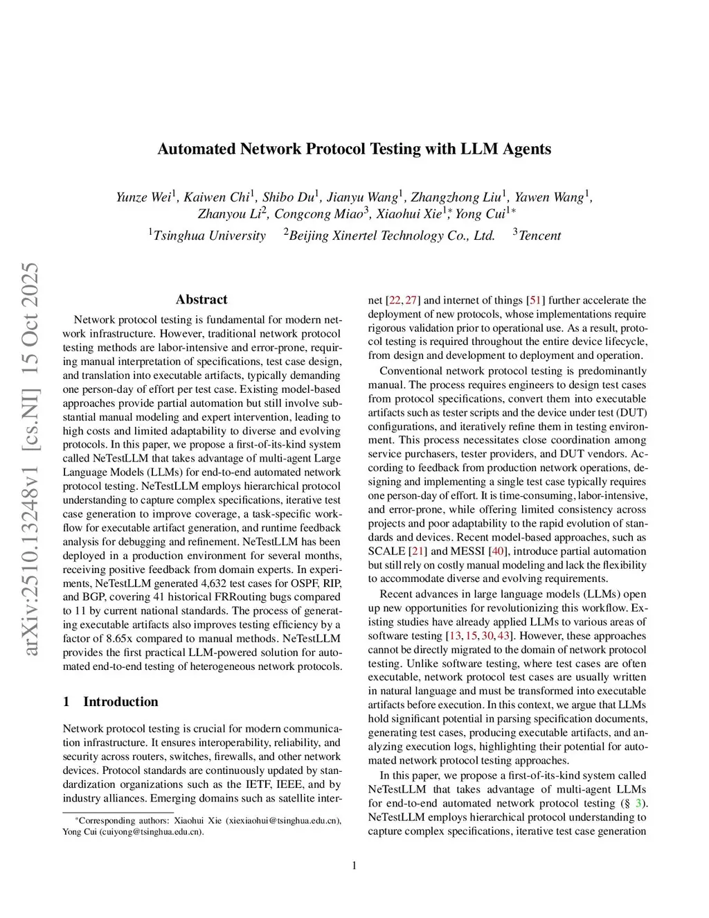 Network protocol testing is fundamental for modern network infrastructure. However, traditional network protocol testing methods are labor-intensive and error-prone, requiring manual interpretation of specifications, test case design, and translation into executable artifacts, typically demanding one person-day of effort per test case. Existing model-based approaches provide partial automation but still involve substantial manual modeling and expert intervention, leading to high costs and limited adaptability to diverse and evolving protocols. In this paper, we propose a first-of-its-kind system called NeTestLLM that takes advantage of multi-agent Large Language Models (LLMs) for end-to-end automated network protocol testing. NeTestLLM employs hierarchical protocol understanding to capture complex specifications, iterative test case generation to improve coverage, a task-specific workflow for executable artifact generation, and runtime feedback analysis for debugging and refinement. NeTestLLM has been deployed in a production environment for several months, receiving positive feedback from domain experts. In experiments, NeTestLLM generated 4,632 test cases for OSPF, RIP, and BGP, covering 41 historical FRRouting bugs compared to 11 by current national standards. The process of generating executable artifacts also improves testing efficiency by a factor of 8.65x compared to manual methods. NeTestLLM provides the first practical LLM-powered solution for automated end-to-end testing of heterogeneous network protocols.