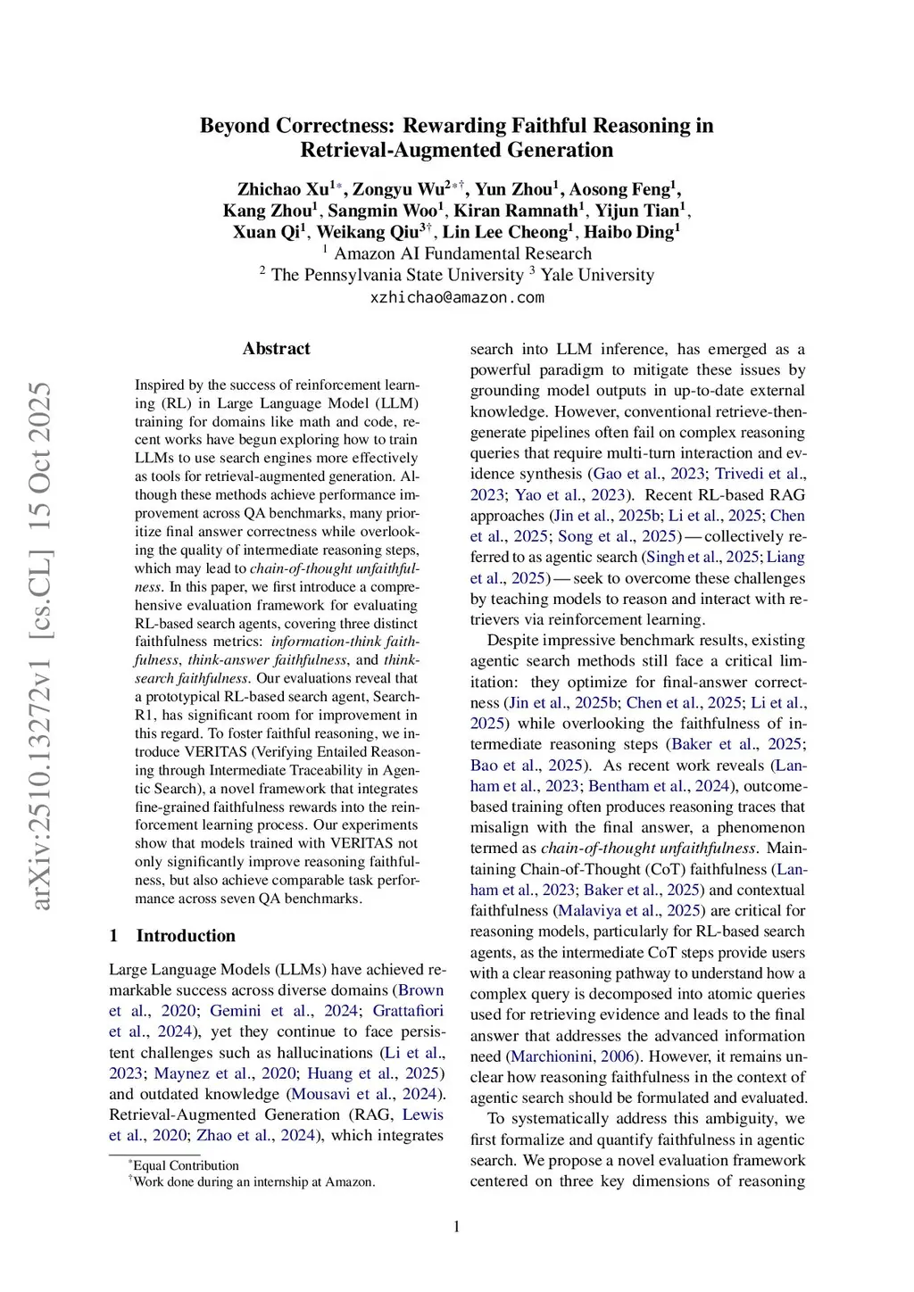 Inspired by the success of reinforcement learning (RL) in Large Language Model (LLM) training for domains like math and code, recent works have begun exploring how to train LLMs to use search engines more effectively as tools for retrieval-augmented generation. Although these methods achieve performance improvement across QA benchmarks, many prioritize final answer correctness while overlooking the quality of intermediate reasoning steps, which may lead to chain-of-thought unfaithfulness. In this paper, we first introduce a comprehensive evaluation framework for evaluating RL-based search agents, covering three distinct faithfulness metrics: information-think faithfulness, think-answer faithfulness, and think-search faithfulness. Our evaluations reveal that canonical search agents trained via Reinforcement Learning from Verifiable Reward (RLVR) -- including SearchR1 and ReSearch -- have significant room for improvement in this regard. To foster faithful reasoning, we introduce VERITAS(Verifying Entailed Reasoning through Intermediate Traceability in Agentic Search), a novel framework that integrates fine-grained faithfulness rewards into the reinforcement learning process. Our experiments show that models trained with VERITAS not only significantly improve reasoning faithfulness, but also achieve better task performance compared to the baselines trained against pure outcome-based reward.