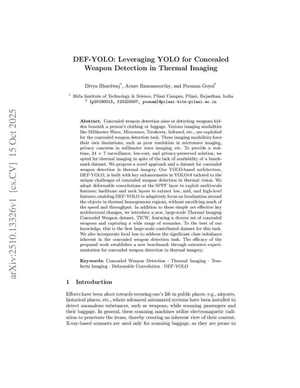 Concealed weapon detection aims at detecting weapons hidden beneath a person's clothing or luggage. Various imaging modalities like Millimeter Wave, Microwave, Terahertz, Infrared, etc., are exploited for the concealed weapon detection task. These imaging modalities have their own limitations, such as poor resolution in microwave imaging, privacy concerns in millimeter wave imaging, etc. To provide a real-time, 24 x 7 surveillance, low-cost, and privacy-preserved solution, we opted for thermal imaging in spite of the lack of availability of a benchmark dataset. We propose a novel approach and a dataset for concealed weapon detection in thermal imagery. Our YOLO-based architecture, DEF-YOLO, is built with key enhancements in YOLOv8 tailored to the unique challenges of concealed weapon detection in thermal vision. We adopt deformable convolutions at the SPPF layer to exploit multi-scale features; backbone and neck layers to extract low, mid, and high-level features, enabling DEF-YOLO to adaptively focus on localization around the objects in thermal homogeneous regions, without sacrificing much of the speed and throughput. In addition to these simple yet effective key architectural changes, we introduce a new, large-scale Thermal Imaging Concealed Weapon dataset, TICW, featuring a diverse set of concealed weapons and capturing a wide range of scenarios. To the best of our knowledge, this is the first large-scale contributed dataset for this task. We also incorporate focal loss to address the significant class imbalance inherent in the concealed weapon detection task. The efficacy of the proposed work establishes a new benchmark through extensive experimentation for concealed weapon detection in thermal imagery.