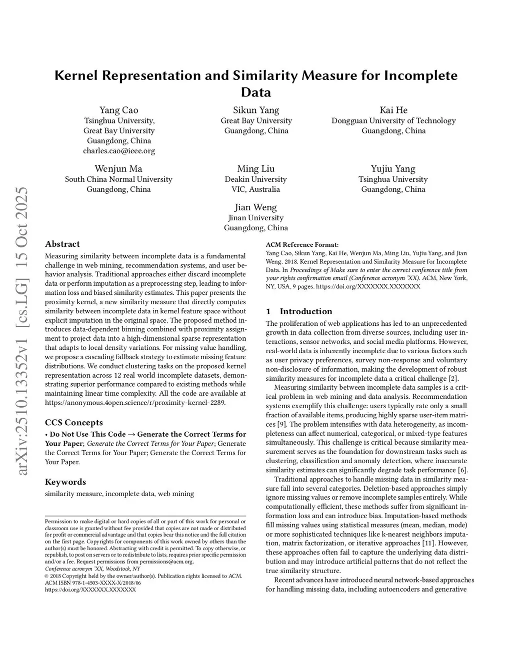 Kernel Representation and Similarity Measure for Incomplete Data