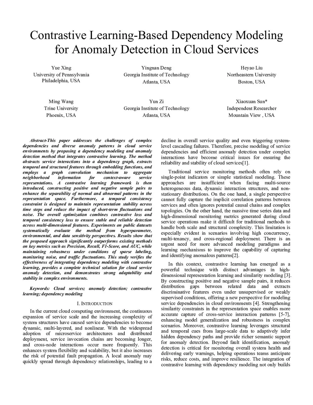 This paper addresses the challenges of complex dependencies and diverse anomaly patterns in cloud service environments by proposing a dependency modeling and anomaly detection method that integrates contrastive learning. The method abstracts service interactions into a dependency graph, extracts temporal and structural features through embedding functions, and employs a graph convolution mechanism to aggregate neighborhood information for context-aware service representations. A contrastive learning framework is then introduced, constructing positive and negative sample pairs to enhance the separability of normal and abnormal patterns in the representation space. Furthermore, a temporal consistency constraint is designed to maintain representation stability across time steps and reduce the impact of short-term fluctuations and noise. The overall optimization combines contrastive loss and temporal consistency loss to ensure stable and reliable detection across multi-dimensional features. Experiments on public datasets systematically evaluate the method from hyperparameter, environmental, and data sensitivity perspectives. Results show that the proposed approach significantly outperforms existing methods on key metrics such as Precision, Recall, F1-Score, and AUC, while maintaining robustness under conditions of sparse labeling, monitoring noise, and traffic fluctuations. This study verifies the effectiveness of integrating dependency modeling with contrastive learning, provides a complete technical solution for cloud service anomaly detection, and demonstrates strong adaptability and stability in complex environments.