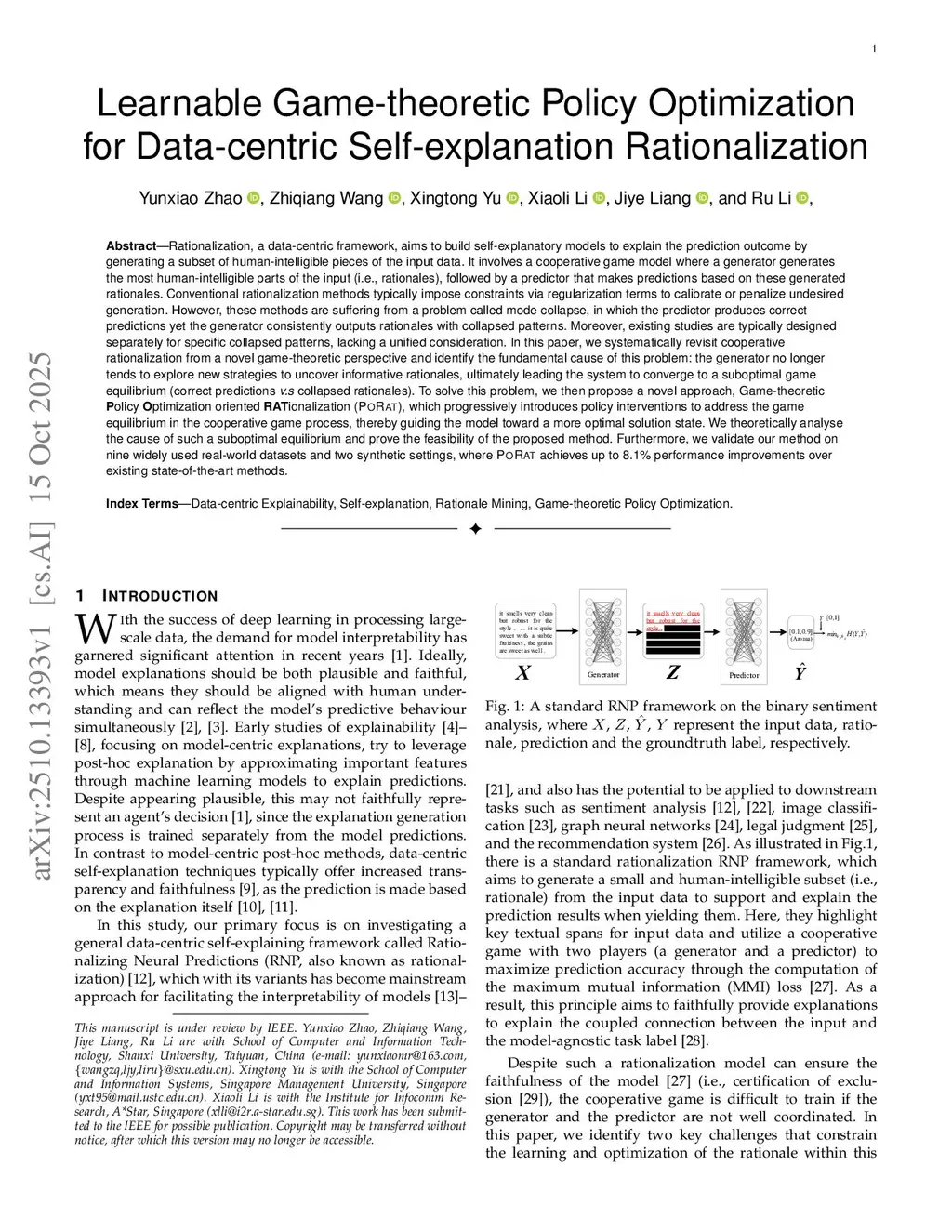 Rationalization, a data-centric framework, aims to build self-explanatory models to explain the prediction outcome by generating a subset of human-intelligible pieces of the input data. It involves a cooperative game model where a generator generates the most human-intelligible parts of the input (i.e., rationales), followed by a predictor that makes predictions based on these generated rationales. Conventional rationalization methods typically impose constraints via regularization terms to calibrate or penalize undesired generation. However, these methods are suffering from a problem called mode collapse, in which the predictor produces correct predictions yet the generator consistently outputs rationales with collapsed patterns. Moreover, existing studies are typically designed separately for specific collapsed patterns, lacking a unified consideration. In this paper, we systematically revisit cooperative rationalization from a novel game-theoretic perspective and identify the fundamental cause of this problem: the generator no longer tends to explore new strategies to uncover informative rationales, ultimately leading the system to converge to a suboptimal game equilibrium (correct predictions v.s collapsed rationales). To solve this problem, we then propose a novel approach, Game-theoretic Policy Optimization oriented RATionalization (PORAT), which progressively introduces policy interventions to address the game equilibrium in the cooperative game process, thereby guiding the model toward a more optimal solution state. We theoretically analyse the cause of such a suboptimal equilibrium and prove the feasibility of the proposed method. Furthermore, we validate our method on nine widely used real-world datasets and two synthetic settings, where PORAT achieves up to 8.1% performance improvements over existing state-of-the-art methods.