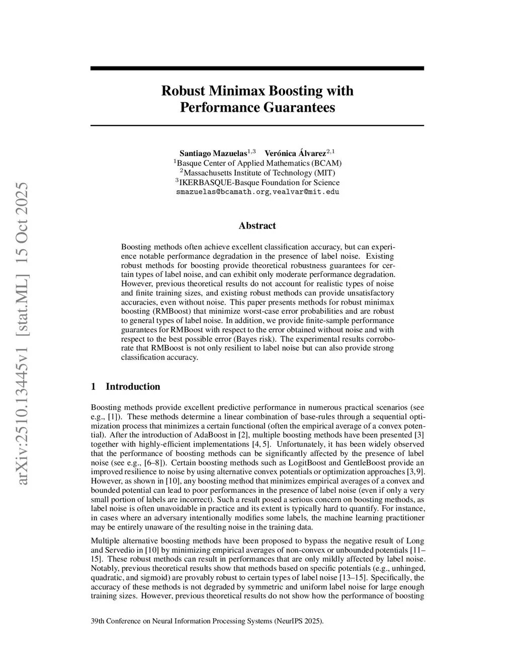 Boosting methods often achieve excellent classification accuracy, but can experience notable performance degradation in the presence of label noise. Existing robust methods for boosting provide theoretical robustness guarantees for certain types of label noise, and can exhibit only moderate performance degradation. However, previous theoretical results do not account for realistic types of noise and finite training sizes, and existing robust methods can provide unsatisfactory accuracies, even without noise. This paper presents methods for robust minimax boosting (RMBoost) that minimize worst-case error probabilities and are robust to general types of label noise. In addition, we provide finite-sample performance guarantees for RMBoost with respect to the error obtained without noise and with respect to the best possible error (Bayes risk). The experimental results corroborate that RMBoost is not only resilient to label noise but can also provide strong classification accuracy.