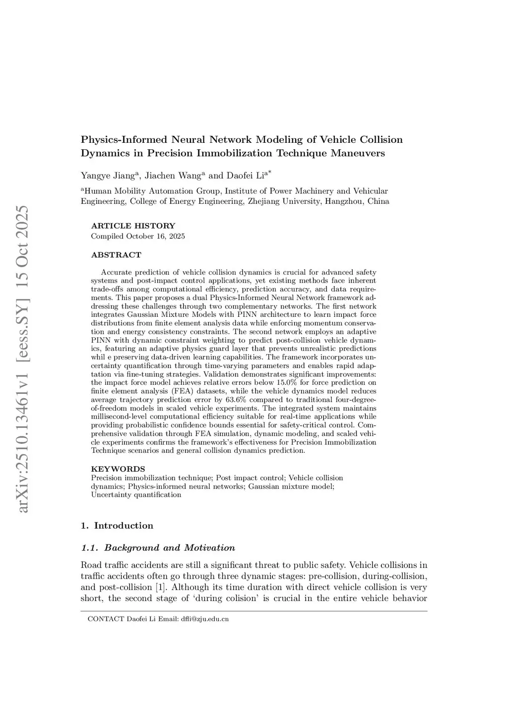 Accurate prediction of vehicle collision dynamics is crucial for advanced safety systems and post-impact control applications, yet existing methods face inherent trade-offs among computational efficiency, prediction accuracy, and data requirements. This paper proposes a dual Physics-Informed Neural Network framework addressing these challenges through two complementary networks. The first network integrates Gaussian Mixture Models with PINN architecture to learn impact force distributions from finite element analysis data while enforcing momentum conservation and energy consistency constraints. The second network employs an adaptive PINN with dynamic constraint weighting to predict post-collision vehicle dynamics, featuring an adaptive physics guard layer that prevents unrealistic predictions whil e preserving data-driven learning capabilities. The framework incorporates uncertainty quantification through time-varying parameters and enables rapid adaptation via fine-tuning strategies. Validation demonstrates significant improvements: the impact force model achieves relative errors below 15.0% for force prediction on finite element analysis (FEA) datasets, while the vehicle dynamics model reduces average trajectory prediction error by 63.6% compared to traditional four-degree-of-freedom models in scaled vehicle experiments. The integrated system maintains millisecond-level computational efficiency suitable for real-time applications while providing probabilistic confidence bounds essential for safety-critical control. Comprehensive validation through FEA simulation, dynamic modeling, and scaled vehicle experiments confirms the framework's effectiveness for Precision Immobilization Technique scenarios and general collision dynamics prediction.