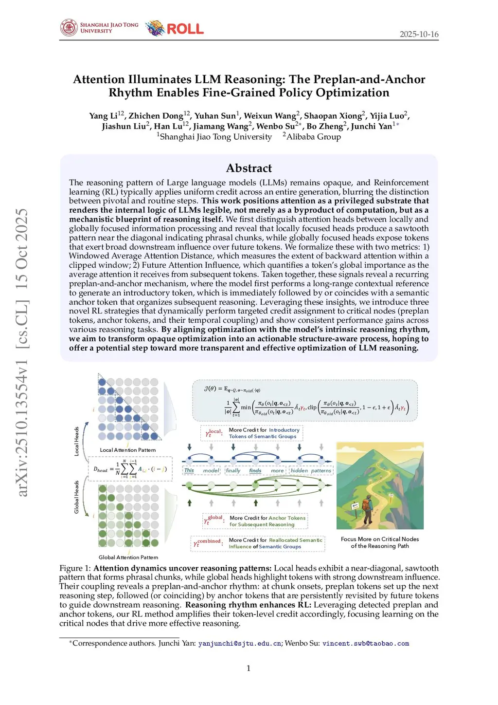 The reasoning pattern of Large language models (LLMs) remains opaque, and Reinforcement learning (RL) typically applies uniform credit across an entire generation, blurring the distinction between pivotal and routine steps. This work positions attention as a privileged substrate that renders the internal logic of LLMs legible, not merely as a byproduct of computation, but as a mechanistic blueprint of reasoning itself. We first distinguish attention heads between locally and globally focused information processing and reveal that locally focused heads produce a sawtooth pattern near the diagonal indicating phrasal chunks, while globally focused heads expose tokens that exert broad downstream influence over future tokens. We formalize these with two metrics: 1) Windowed Average Attention Distance, which measures the extent of backward attention within a clipped window; 2) Future Attention Influence, which quantifies a token's global importance as the average attention it receives from subsequent tokens. Taken together, these signals reveal a recurring preplan-and-anchor mechanism, where the model first performs a long-range contextual reference to generate an introductory token, which is immediately followed by or coincides with a semantic anchor token that organizes subsequent reasoning. Leveraging these insights, we introduce three novel RL strategies that dynamically perform targeted credit assignment to critical nodes (preplan tokens, anchor tokens, and their temporal coupling) and show consistent performance gains across various reasoning tasks. By aligning optimization with the model's intrinsic reasoning rhythm, we aim to transform opaque optimization into an actionable structure-aware process, hoping to offer a potential step toward more transparent and effective optimization of LLM reasoning.