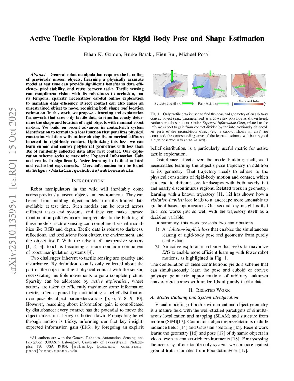General robot manipulation requires the handling of previously unseen objects. Learning a physically accurate model at test time can provide significant benefits in data efficiency, predictability, and reuse between tasks. Tactile sensing can compliment vision with its robustness to occlusion, but its temporal sparsity necessitates careful online exploration to maintain data efficiency. Direct contact can also cause an unrestrained object to move, requiring both shape and location estimation. In this work, we propose a learning and exploration framework that uses only tactile data to simultaneously determine the shape and location of rigid objects with minimal robot motion. We build on recent advances in contact-rich system identification to formulate a loss function that penalizes physical constraint violation without introducing the numerical stiffness inherent in rigid-body contact. Optimizing this loss, we can learn cuboid and convex polyhedral geometries with less than 10s of randomly collected data after first contact. Our exploration scheme seeks to maximize Expected Information Gain and results in significantly faster learning in both simulated and real-robot experiments. More information can be found atthis https URL