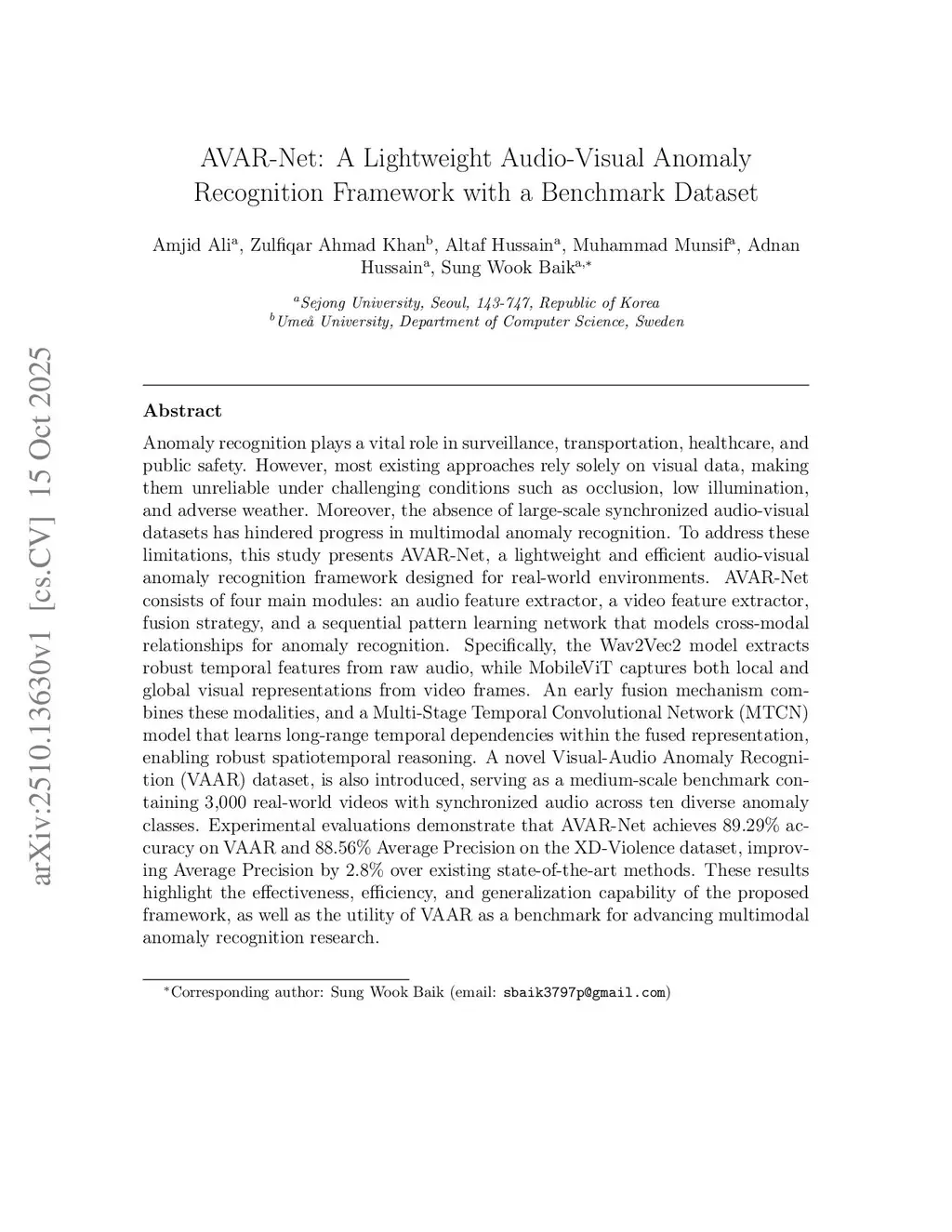 Anomaly recognition plays a vital role in surveillance, transportation, healthcare, and public safety. However, most existing approaches rely solely on visual data, making them unreliable under challenging conditions such as occlusion, low illumination, and adverse weather. Moreover, the absence of large-scale synchronized audio-visual datasets has hindered progress in multimodal anomaly recognition. To address these limitations, this study presents AVAR-Net, a lightweight and efficient audio-visual anomaly recognition framework designed for real-world environments. AVAR-Net consists of four main modules: an audio feature extractor, a video feature extractor, fusion strategy, and a sequential pattern learning network that models cross-modal relationships for anomaly recognition. Specifically, the Wav2Vec2 model extracts robust temporal features from raw audio, while MobileViT captures both local and global visual representations from video frames. An early fusion mechanism combines these modalities, and a Multi-Stage Temporal Convolutional Network (MTCN) model that learns long-range temporal dependencies within the fused representation, enabling robust spatiotemporal reasoning. A novel Visual-Audio Anomaly Recognition (VAAR) dataset, is also introduced, serving as a medium-scale benchmark containing 3,000 real-world videos with synchronized audio across ten diverse anomaly classes. Experimental evaluations demonstrate that AVAR-Net achieves 89.29% accuracy on VAAR and 88.56% Average Precision on the XD-Violence dataset, improving Average Precision by 2.8% over existing state-of-the-art methods. These results highlight the effectiveness, efficiency, and generalization capability of the proposed framework, as well as the utility of VAAR as a benchmark for advancing multimodal anomaly recognition research.