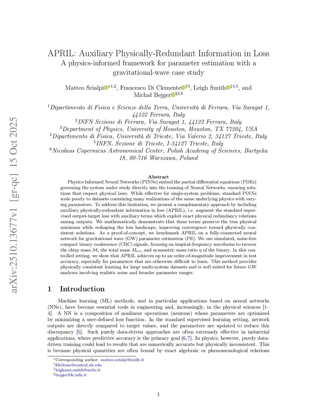 Physics-Informed Neural Networks (PINNs) embed the partial differential equations (PDEs) governing the system under study directly into the training of Neural Networks, ensuring solutions that respect physical laws. While effective for single-system problems, standard PINNs scale poorly to datasets containing many realizations of the same underlying physics with varying parameters. To address this limitation, we present a complementary approach by including auxiliary physically-redundant information in loss (APRIL), i.e. augment the standard supervised output-target loss with auxiliary terms which exploit exact physical redundancy relations among outputs. We mathematically demonstrate that these terms preserve the true physical minimum while reshaping the loss landscape, improving convergence toward physically consistent solutions. As a proof-of-concept, we benchmark APRIL on a fully-connected neural network for gravitational wave (GW) parameter estimation (PE). We use simulated, noise-free compact binary coalescence (CBC) signals, focusing on inspiral-frequency waveforms to recover the chirp mass , the total mass , and symmetric mass ratio of the binary. In this controlled setting, we show that APRIL achieves up to an order-of-magnitude improvement in test accuracy, especially for parameters that are otherwise difficult to learn. This method provides physically consistent learning for large multi-system datasets and is well suited for future GW analyses involving realistic noise and broader parameter ranges.