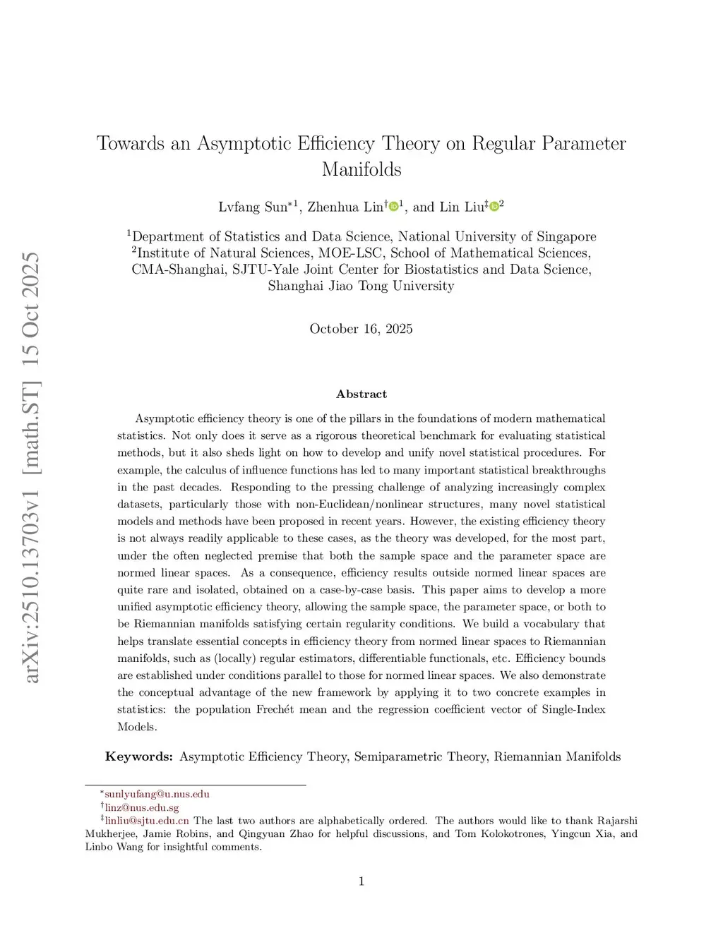 Asymptotic efficiency theory is one of the pillars in the foundations of modern mathematical statistics. Not only does it serve as a rigorous theoretical benchmark for evaluating statistical methods, but it also sheds light on how to develop and unify novel statistical procedures. For example, the calculus of influence functions has led to many important statistical breakthroughs in the past decades. Responding to the pressing challenge of analyzing increasingly complex datasets, particularly those with non-Euclidean/nonlinear structures, many novel statistical models and methods have been proposed in recent years. However, the existing efficiency theory is not always readily applicable to these cases, as the theory was developed, for the most part, under the often neglected premise that both the sample space and the parameter space are normed linear spaces. As a consequence, efficiency results outside normed linear spaces are quite rare and isolated, obtained on a case-by-case basis. This paper aims to develop a more unified asymptotic efficiency theory, allowing the sample space, the parameter space, or both to be Riemannian manifolds satisfying certain regularity conditions. We build a vocabulary that helps translate essential concepts in efficiency theory from normed linear spaces to Riemannian manifolds, such as (locally) regular estimators, differentiable functionals, etc. Efficiency bounds are established under conditions parallel to those for normed linear spaces. We also demonstrate the conceptual advantage of the new framework by applying it to two concrete examples in statistics: the population Frechet mean and the regression coefficient vector of Single-Index Models.