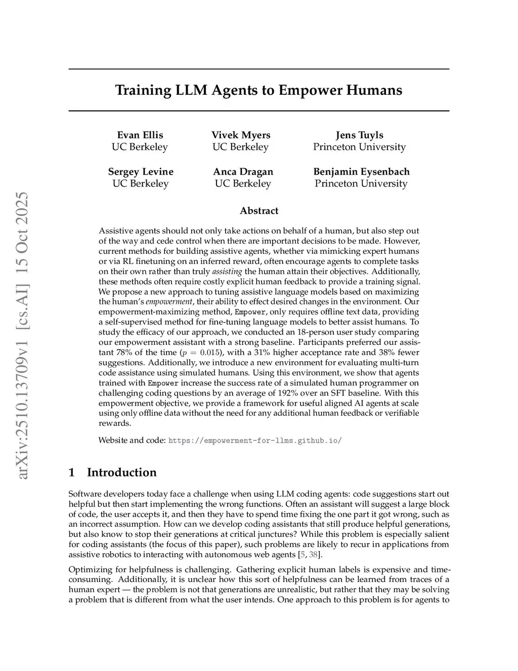 Assistive agents should not only take actions on behalf of a human, but also step out of the way and cede control when there are important decisions to be made. However, current methods for building assistive agents, whether via mimicking expert humans or via RL finetuning on an inferred reward, often encourage agents to complete tasks on their own rather than truly assisting the human attain their objectives. Additionally, these methods often require costly explicit human feedback to provide a training signal. We propose a new approach to tuning assistive language models based on maximizing the human's empowerment, their ability to effect desired changes in the environment. Our empowerment-maximizing method, Empower, only requires offline text data, providing a self-supervised method for fine-tuning language models to better assist humans. To study the efficacy of our approach, we conducted an 18-person user study comparing our empowerment assistant with a strong baseline. Participants preferred our assistant 78% of the time (p=0.015), with a 31% higher acceptance rate and 38% fewer suggestions. Additionally, we introduce a new environment for evaluating multi-turn code assistance using simulated humans. Using this environment, we show that agents trained with Empower increase the success rate of a simulated human programmer on challenging coding questions by an average of 192% over an SFT baseline. With this empowerment objective, we provide a framework for useful aligned AI agents at scale using only offline data without the need for any additional human feedback or verifiable rewards.