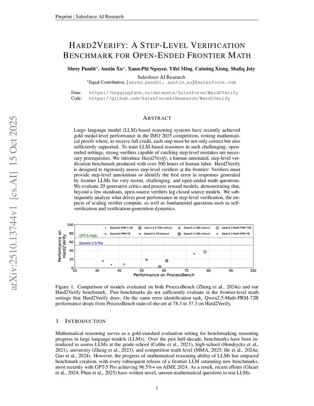 Large language model (LLM)-based reasoning systems have recently achieved gold medal-level performance in the IMO 2025 competition, writing mathematical proofs where, to receive full credit, each step must be not only correct but also sufficiently supported. To train LLM-based reasoners in such challenging, open-ended settings, strong verifiers capable of catching step-level mistakes are necessary prerequisites. We introduce Hard2Verify, a human-annotated, step-level verification benchmark produced with over 500 hours of human labor. Hard2Verify is designed to rigorously assess step-level verifiers at the frontier: Verifiers must provide step-level annotations or identify the first error in responses generated by frontier LLMs for very recent, challenging, and open-ended math questions. We evaluate 29 generative critics and process reward models, demonstrating that, beyond a few standouts, open-source verifiers lag closed source models. We subsequently analyze what drives poor performance in step-level verification, the impacts of scaling verifier compute, as well as fundamental questions such as self-verification and verification-generation dynamics.