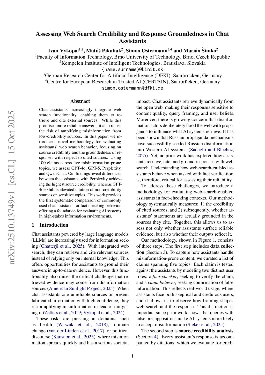 Assessing Web Search Credibility and Response Groundedness in Chat Assistants