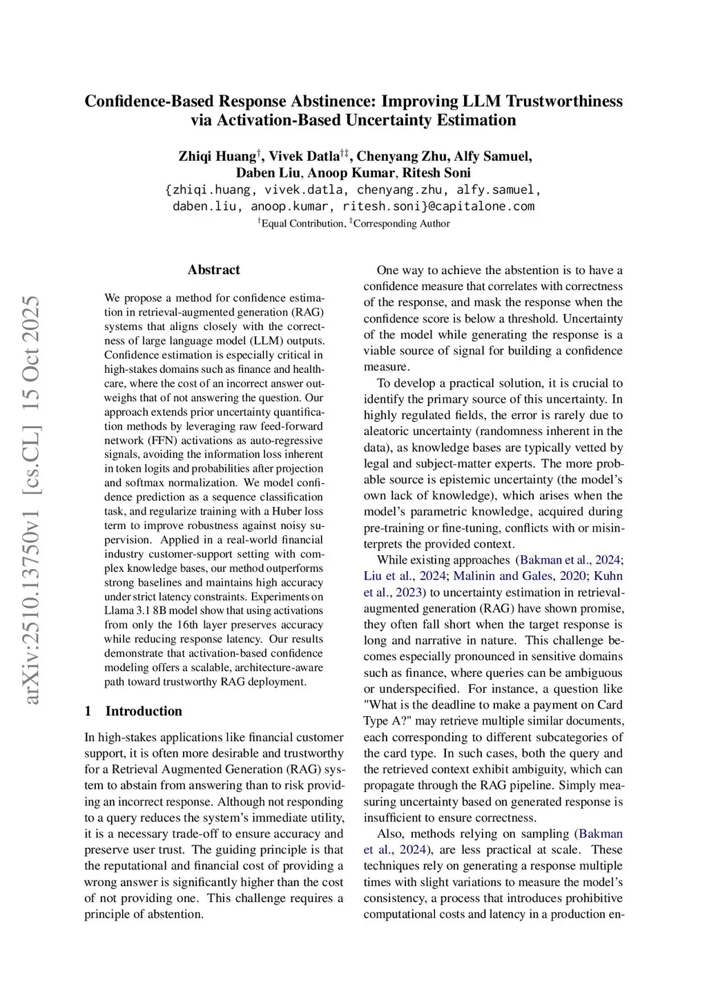We propose a method for confidence estimation in retrieval-augmented generation (RAG) systems that aligns closely with the correctness of large language model (LLM) outputs. Confidence estimation is especially critical in high-stakes domains such as finance and healthcare, where the cost of an incorrect answer outweighs that of not answering the question. Our approach extends prior uncertainty quantification methods by leveraging raw feed-forward network (FFN) activations as auto-regressive signals, avoiding the information loss inherent in token logits and probabilities after projection and softmax normalization. We model confidence prediction as a sequence classification task, and regularize training with a Huber loss term to improve robustness against noisy supervision. Applied in a real-world financial industry customer-support setting with complex knowledge bases, our method outperforms strong baselines and maintains high accuracy under strict latency constraints. Experiments on Llama 3.1 8B model show that using activations from only the 16th layer preserves accuracy while reducing response latency. Our results demonstrate that activation-based confidence modeling offers a scalable, architecture-aware path toward trustworthy RAG deployment.