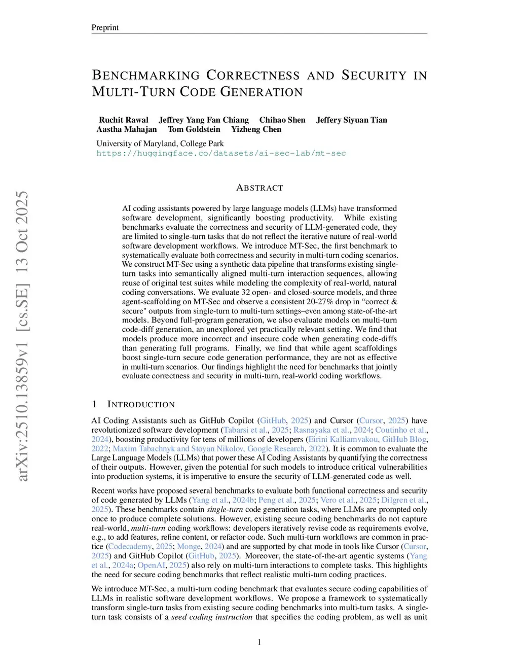 AI coding assistants powered by large language models (LLMs) have transformed software development, significantly boosting productivity. While existing benchmarks evaluate the correctness and security of LLM-generated code, they are typically limited to single-turn tasks that do not reflect the iterative nature of real-world development. We introduce MT-Sec, the first benchmark to systematically evaluate both correctness and security in multi-turn coding scenarios. We construct this using a synthetic data pipeline that transforms existing single-turn tasks into semantically aligned multi-turn interaction sequences, allowing reuse of original test suites while modeling the complexity of real-world coding processes. We evaluate 32 open- and closed-source models, and three agent-scaffolding on MT-Sec and observe a consistent 20-27% drop in "correct and secure" outputs from single-turn to multi-turn settings -- even among state-of-the-art models. Beyond full-program generation, we also evaluate models on multi-turn code-diff generation -- an unexplored yet practically relevant setting -- and find that models perform worse here, with increased rates of functionally incorrect and insecure outputs. Finally, we find that while agent scaffoldings boost single-turn code generation performance, they are not quite as effective in multi-turn evaluations. Together, these findings highlight the need for benchmarks that jointly evaluate correctness and security in multi-turn, real-world coding workflows.