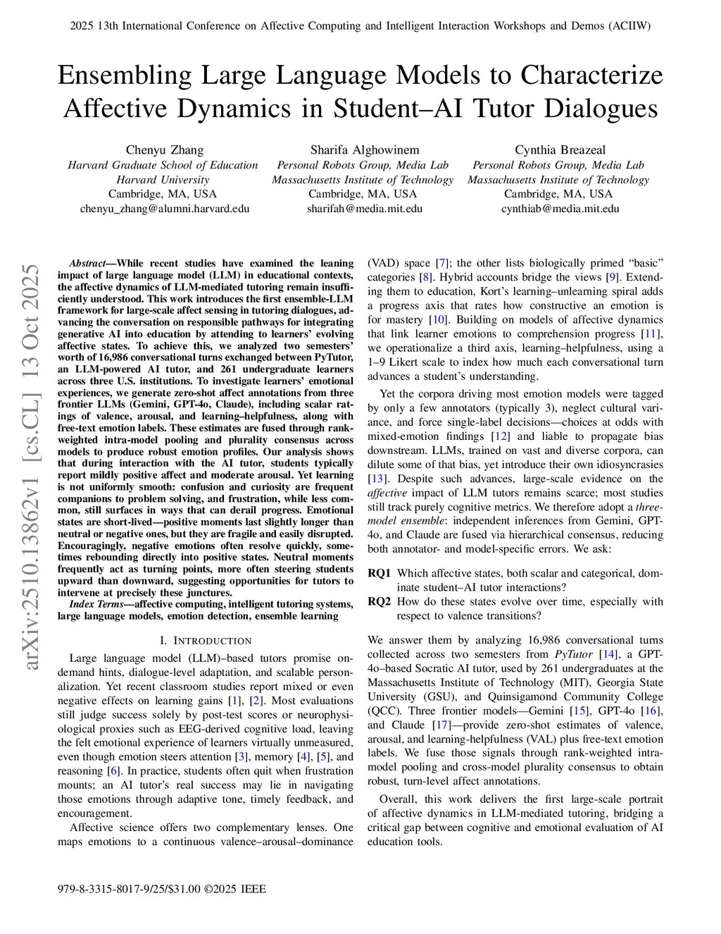 Ensembling Large Language Models to Characterize Affective Dynamics in Student-AI Tutor Dialogues