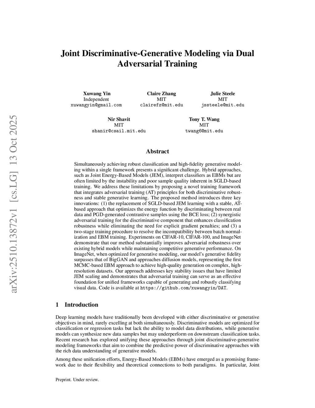 Joint Discriminative-Generative Modeling via Dual Adversarial Training