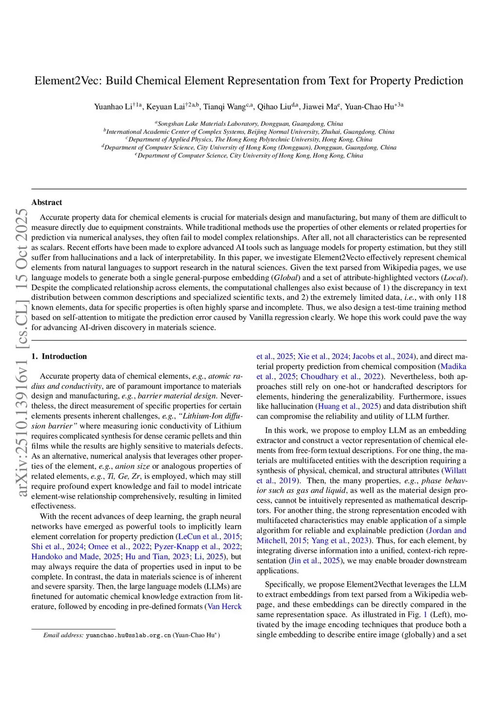 Accurate property data for chemical elements is crucial for materials design and manufacturing, but many of them are difficult to measure directly due to equipment constraints. While traditional methods use the properties of other elements or related properties for prediction via numerical analyses, they often fail to model complex relationships. After all, not all characteristics can be represented as scalars. Recent efforts have been made to explore advanced AI tools such as language models for property estimation, but they still suffer from hallucinations and a lack of interpretability. In this paper, we investigate Element2Vecto effectively represent chemical elements from natural languages to support research in the natural sciences. Given the text parsed from Wikipedia pages, we use language models to generate both a single general-purpose embedding (Global) and a set of attribute-highlighted vectors (Local). Despite the complicated relationship across elements, the computational challenges also exist because of 1) the discrepancy in text distribution between common descriptions and specialized scientific texts, and 2) the extremely limited data, i.e., with only 118 known elements, data for specific properties is often highly sparse and incomplete. Thus, we also design a test-time training method based on self-attention to mitigate the prediction error caused by Vanilla regression clearly. We hope this work could pave the way for advancing AI-driven discovery in materials science.
