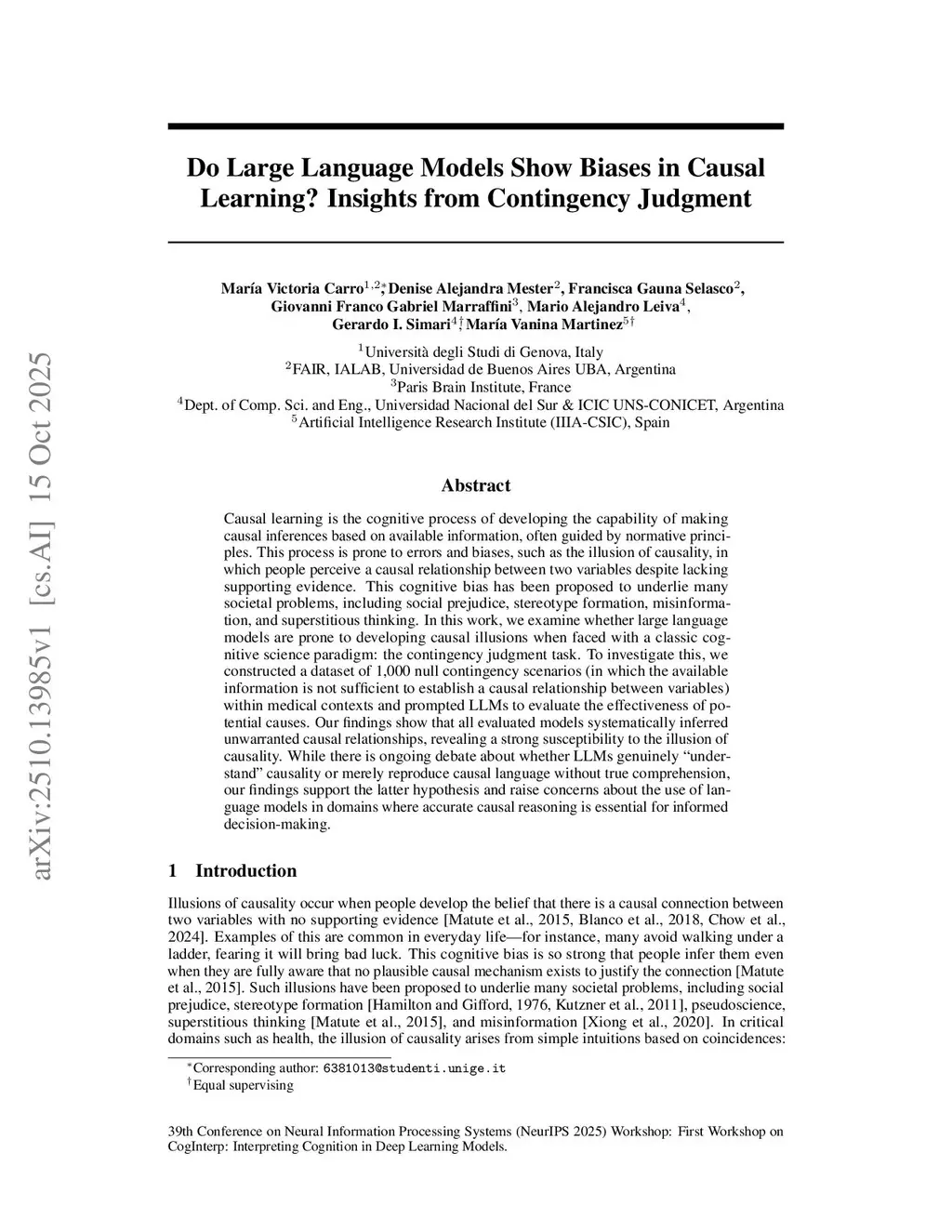 Causal learning is the cognitive process of developing the capability of making causal inferences based on available information, often guided by normative principles. This process is prone to errors and biases, such as the illusion of causality, in which people perceive a causal relationship between two variables despite lacking supporting evidence. This cognitive bias has been proposed to underlie many societal problems, including social prejudice, stereotype formation, misinformation, and superstitious thinking. In this work, we examine whether large language models are prone to developing causal illusions when faced with a classic cognitive science paradigm: the contingency judgment task. To investigate this, we constructed a dataset of 1,000 null contingency scenarios (in which the available information is not sufficient to establish a causal relationship between variables) within medical contexts and prompted LLMs to evaluate the effectiveness of potential causes. Our findings show that all evaluated models systematically inferred unwarranted causal relationships, revealing a strong susceptibility to the illusion of causality. While there is ongoing debate about whether LLMs genuinely understand causality or merely reproduce causal language without true comprehension, our findings support the latter hypothesis and raise concerns about the use of language models in domains where accurate causal reasoning is essential for informed decision-making.