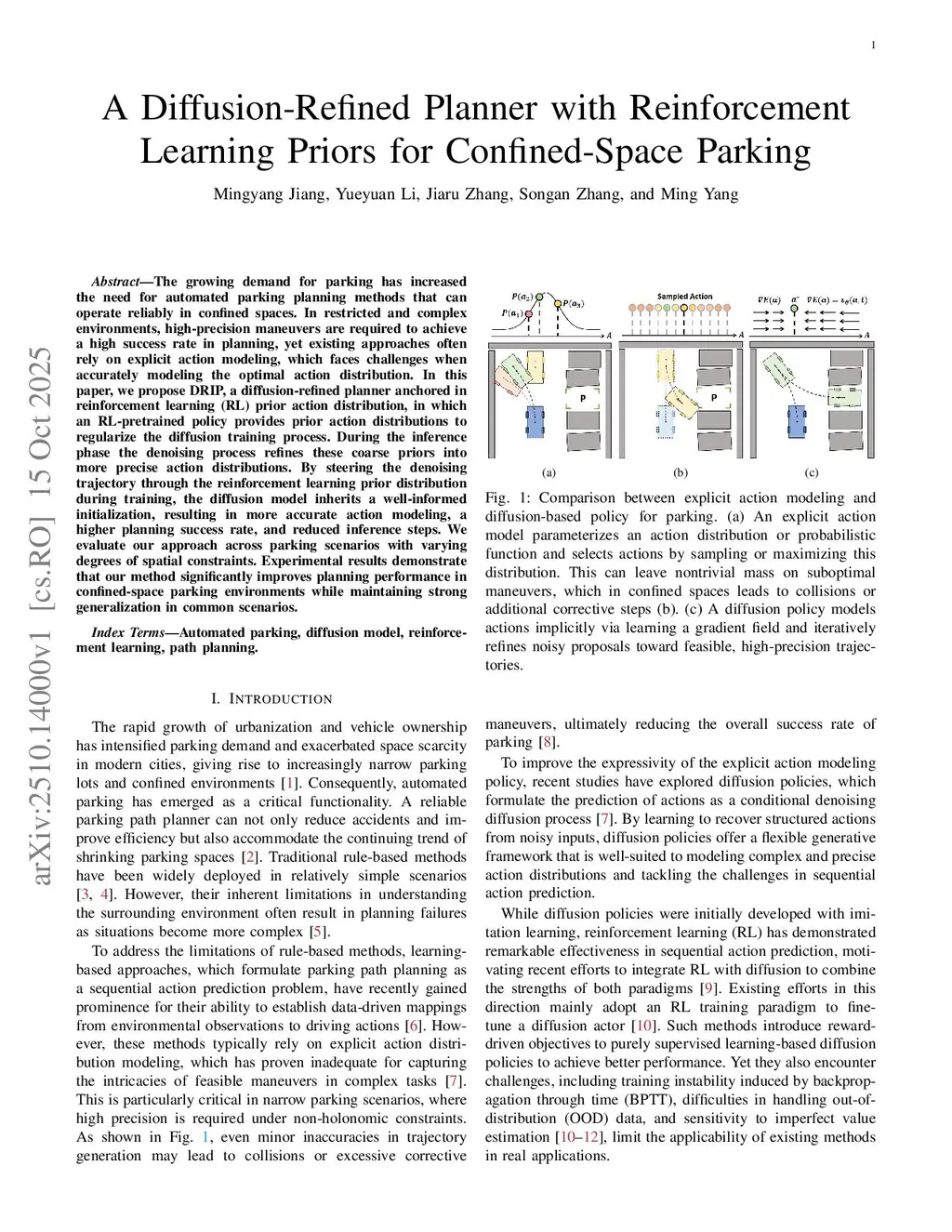 The growing demand for parking has increased the need for automated parking planning methods that can operate reliably in confined spaces. In restricted and complex environments, high-precision maneuvers are required to achieve a high success rate in planning, yet existing approaches often rely on explicit action modeling, which faces challenges when accurately modeling the optimal action distribution. In this paper, we propose DRIP, a diffusion-refined planner anchored in reinforcement learning (RL) prior action distribution, in which an RL-pretrained policy provides prior action distributions to regularize the diffusion training process. During the inference phase the denoising process refines these coarse priors into more precise action distributions. By steering the denoising trajectory through the reinforcement learning prior distribution during training, the diffusion model inherits a well-informed initialization, resulting in more accurate action modeling, a higher planning success rate, and reduced inference steps. We evaluate our approach across parking scenarios with varying degrees of spatial constraints. Experimental results demonstrate that our method significantly improves planning performance in confined-space parking environments while maintaining strong generalization in common scenarios.