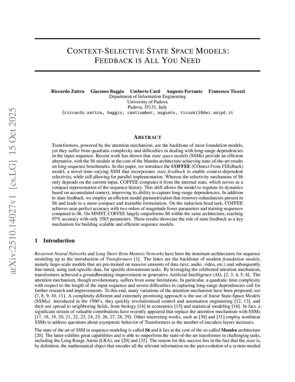 Transformers, powered by the attention mechanism, are the backbone of most foundation models, yet they suffer from quadratic complexity and difficulties in dealing with long-range dependencies in the input sequence. Recent work has shown that state space models (SSMs) provide a promising alternative. In this paper, we introduce the COFFEE (COntext From FEEdback) model, a novel time-varying SSM that incorporates state feedback to enable context-dependent selectivity, while still allowing for parallel implementation. This idea allows the model to regulate its dynamics based on the context described by the internal state, which embodies a compact representation of the input history. State feedback allows COFFEE to improve its ability to capture long-range dependencies: on the induction head task, it achieves near-perfect accuracy with two orders of magnitude fewer parameters and training sequences compared to S6 (the SSM of Mamba). On MNIST, COFFEE largely outperforms S6 within the same architecture, reaching 97% accuracy with only 3585 parameters. These results showcase the role of state feedback as a key mechanism for building scalable and efficient sequence models.
