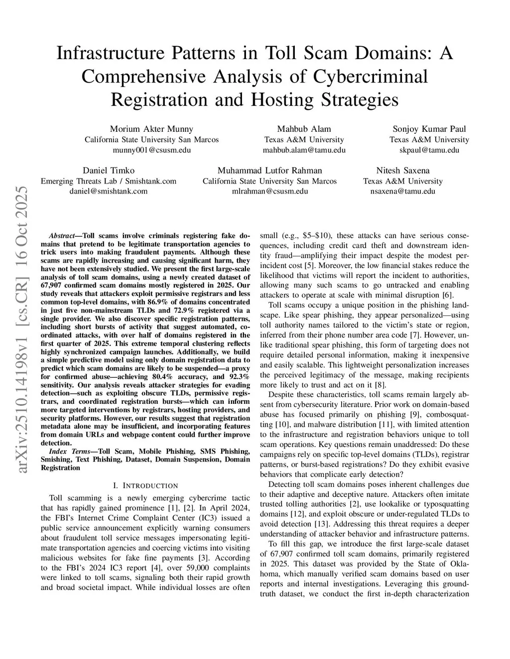Infrastructure Patterns in Toll Scam Domains: A Comprehensive Analysis of Cybercriminal Registration and Hosting Strategies