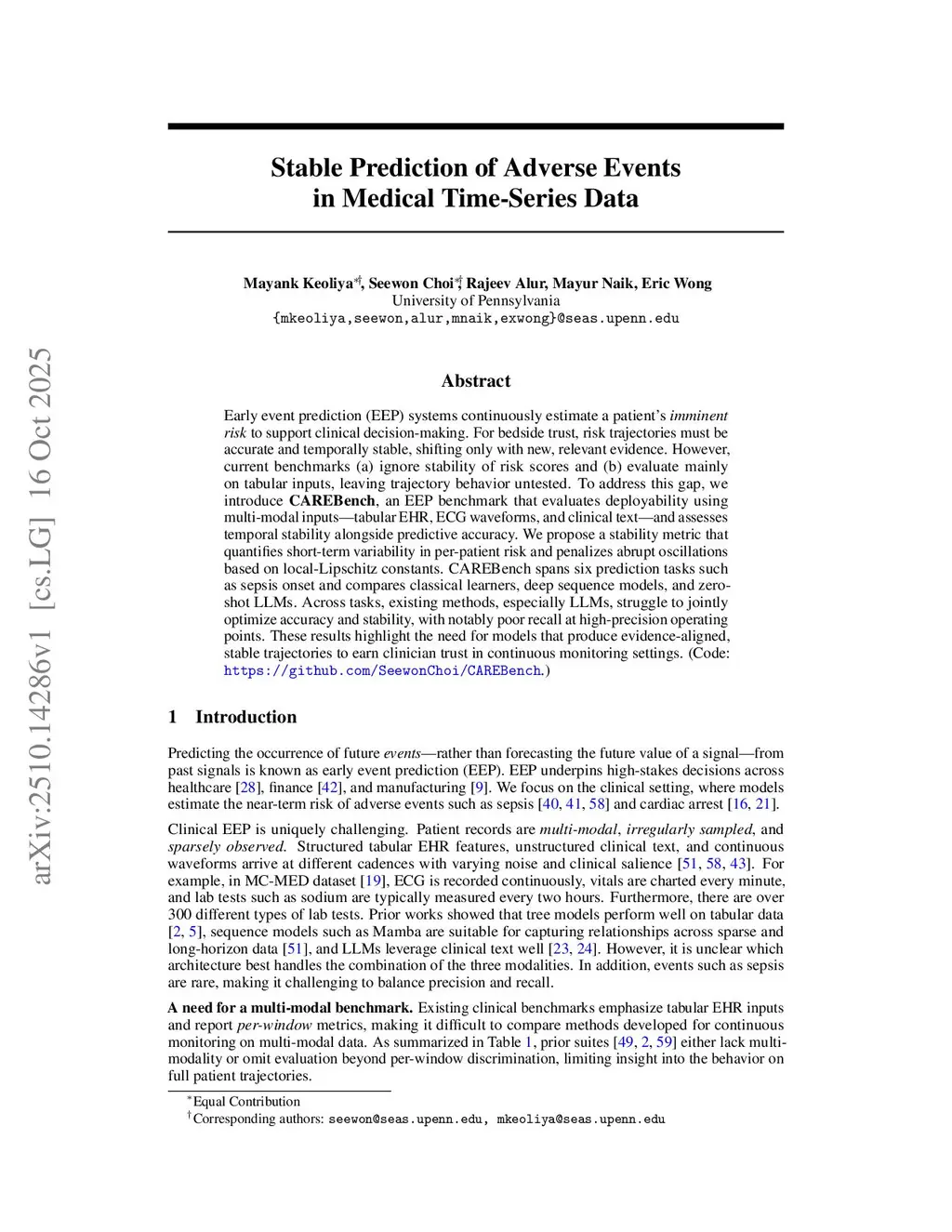 Early event prediction (EEP) systems continuously estimate a patient's imminent risk to support clinical decision-making. For bedside trust, risk trajectories must be accurate and temporally stable, shifting only with new, relevant evidence. However, current benchmarks (a) ignore stability of risk scores and (b) evaluate mainly on tabular inputs, leaving trajectory behavior untested. To address this gap, we introduce CAREBench, an EEP benchmark that evaluates deployability using multi-modal inputs-tabular EHR, ECG waveforms, and clinical text-and assesses temporal stability alongside predictive accuracy. We propose a stability metric that quantifies short-term variability in per-patient risk and penalizes abrupt oscillations based on local-Lipschitz constants. CAREBench spans six prediction tasks such as sepsis onset and compares classical learners, deep sequence models, and zero-shot LLMs. Across tasks, existing methods, especially LLMs, struggle to jointly optimize accuracy and stability, with notably poor recall at high-precision operating points. These results highlight the need for models that produce evidence-aligned, stable trajectories to earn clinician trust in continuous monitoring settings. (Code:this https URL.)