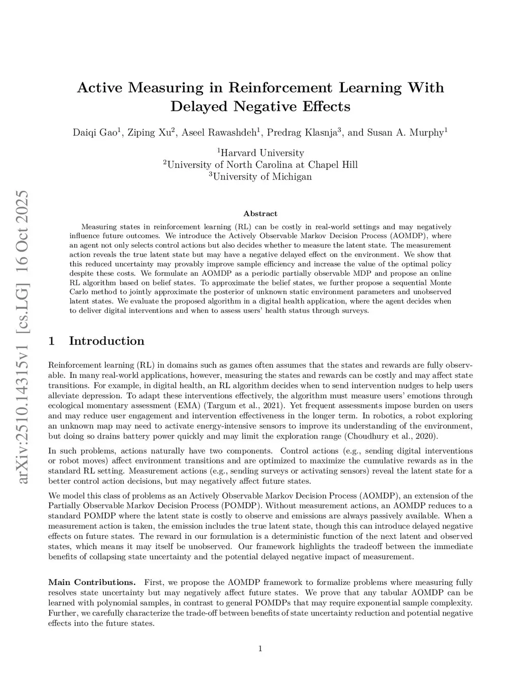 Measuring states in reinforcement learning (RL) can be costly in real-world settings and may negatively influence future outcomes. We introduce the Actively Observable Markov Decision Process (AOMDP), where an agent not only selects control actions but also decides whether to measure the latent state. The measurement action reveals the true latent state but may have a negative delayed effect on the environment. We show that this reduced uncertainty may provably improve sample efficiency and increase the value of the optimal policy despite these costs. We formulate an AOMDP as a periodic partially observable MDP and propose an online RL algorithm based on belief states. To approximate the belief states, we further propose a sequential Monte Carlo method to jointly approximate the posterior of unknown static environment parameters and unobserved latent states. We evaluate the proposed algorithm in a digital health application, where the agent decides when to deliver digital interventions and when to assess users' health status through surveys.