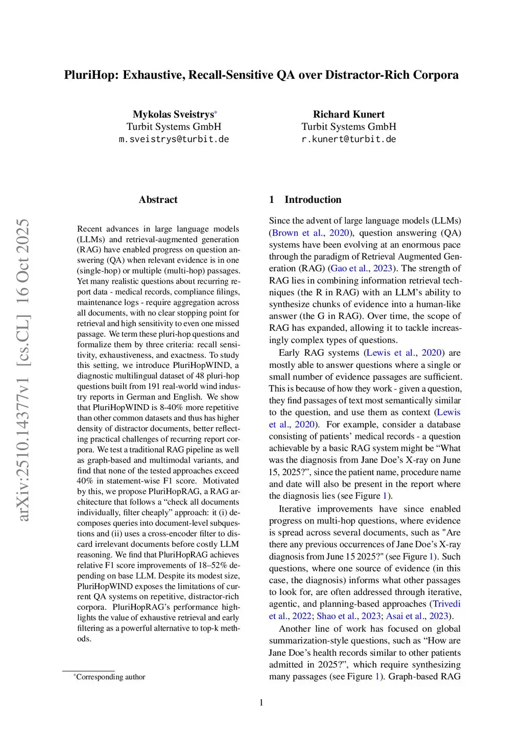 Recent advances in large language models (LLMs) and retrieval-augmented generation (RAG) have enabled progress on question answering (QA) when relevant evidence is in one (single-hop) or multiple (multi-hop) passages. Yet many realistic questions about recurring report data - medical records, compliance filings, maintenance logs - require aggregation across all documents, with no clear stopping point for retrieval and high sensitivity to even one missed passage. We term these pluri-hop questions and formalize them by three criteria: recall sensitivity, exhaustiveness, and exactness. To study this setting, we introduce PluriHopWIND, a diagnostic multilingual dataset of 48 pluri-hop questions built from 191 real-world wind industry reports in German and English. We show that PluriHopWIND is 8-40% more repetitive than other common datasets and thus has higher density of distractor documents, better reflecting practical challenges of recurring report corpora. We test a traditional RAG pipeline as well as graph-based and multimodal variants, and find that none of the tested approaches exceed 40% in statement-wise F1 score. Motivated by this, we propose PluriHopRAG, a RAG architecture that follows a "check all documents individually, filter cheaply" approach: it (i) decomposes queries into document-level subquestions and (ii) uses a cross-encoder filter to discard irrelevant documents before costly LLM reasoning. We find that PluriHopRAG achieves relative F1 score improvements of 18-52% depending on base LLM. Despite its modest size, PluriHopWIND exposes the limitations of current QA systems on repetitive, distractor-rich corpora. PluriHopRAG's performance highlights the value of exhaustive retrieval and early filtering as a powerful alternative to top-k methods.