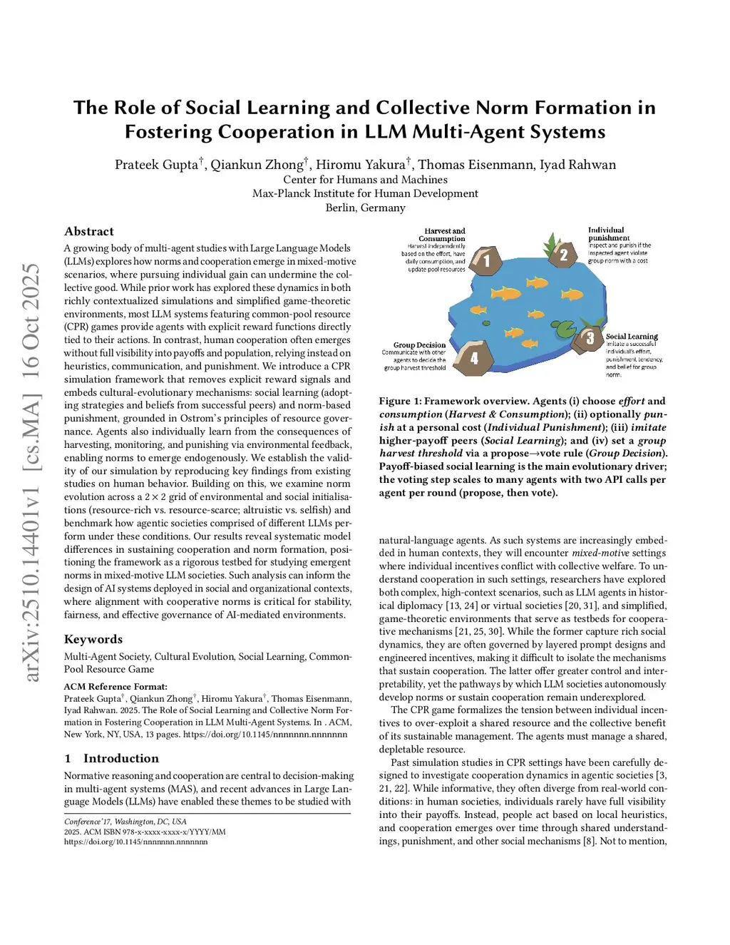 A growing body of multi-agent studies with LLMs explores how norms and cooperation emerge in mixed-motive scenarios, where pursuing individual gain can undermine the collective good. While prior work has explored these dynamics in both richly contextualized simulations and simplified game-theoretic environments, most LLM systems featuring common-pool resource (CPR) games provide agents with explicit reward functions directly tied to their actions. In contrast, human cooperation often emerges without explicit knowledge of the payoff structure or how individual actions translate into long-run outcomes, relying instead on heuristics, communication, and enforcement. We introduce a CPR simulation framework that removes explicit reward signals and embeds cultural-evolutionary mechanisms: social learning (adopting strategies and beliefs from successful peers) and norm-based punishment, grounded in Ostrom's principles of resource governance. Agents also individually learn from the consequences of harvesting, monitoring, and punishing via environmental feedback, enabling norms to emerge endogenously. We establish the validity of our simulation by reproducing key findings from existing studies on human behavior. Building on this, we examine norm evolution across a grid of environmental and social initialisations (resource-rich vs. resource-scarce; altruistic vs. selfish) and benchmark how agentic societies comprised of different LLMs perform under these conditions. Our results reveal systematic model differences in sustaining cooperation and norm formation, positioning the framework as a rigorous testbed for studying emergent norms in mixed-motive LLM societies. Such analysis can inform the design of AI systems deployed in social and organizational contexts, where alignment with cooperative norms is critical for stability, fairness, and effective governance of AI-mediated environments.