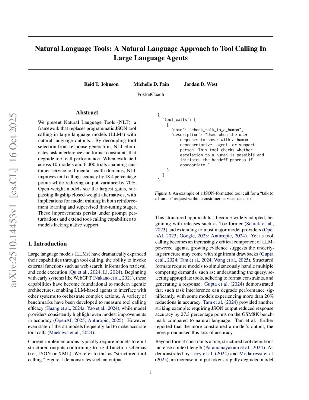 We present Natural Language Tools (NLT), a framework that replaces programmatic JSON tool calling in large language models (LLMs) with natural language outputs. By decoupling tool selection from response generation, NLT eliminates task interference and format constraints that degrade tool call performance. When evaluated across 10 models and 6,400 trials spanning customer service and mental health domains, NLT improves tool calling accuracy by 18.4 percentage points while reducing output variance by 70%. Open-weight models see the largest gains, surpassing flagship closed-weight alternatives, with implications for model training in both reinforcement learning and supervised fine-tuning stages. These improvements persist under prompt perturbations and extend tool-calling capabilities to models lacking native support.
