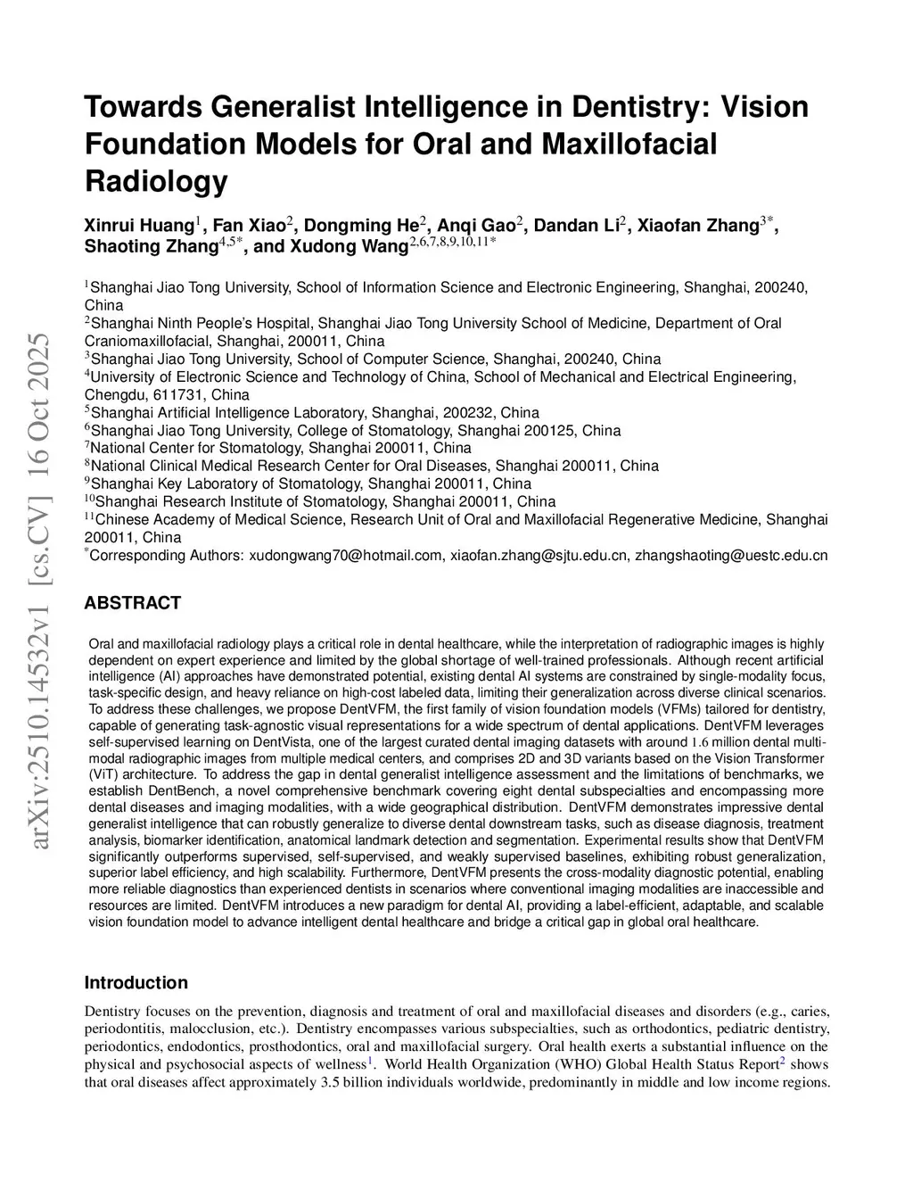 Oral and maxillofacial radiology plays a vital role in dental healthcare, but radiographic image interpretation is limited by a shortage of trained professionals. While AI approaches have shown promise, existing dental AI systems are restricted by their single-modality focus, task-specific design, and reliance on costly labeled data, hindering their generalization across diverse clinical scenarios. To address these challenges, we introduce DentVFM, the first family of vision foundation models (VFMs) designed for dentistry. DentVFM generates task-agnostic visual representations for a wide range of dental applications and uses self-supervised learning on DentVista, a large curated dental imaging dataset with approximately 1.6 million multi-modal radiographic images from various medical centers. DentVFM includes 2D and 3D variants based on the Vision Transformer (ViT) architecture. To address gaps in dental intelligence assessment and benchmarks, we introduce DentBench, a comprehensive benchmark covering eight dental subspecialties, more diseases, imaging modalities, and a wide geographical distribution. DentVFM shows impressive generalist intelligence, demonstrating robust generalization to diverse dental tasks, such as disease diagnosis, treatment analysis, biomarker identification, and anatomical landmark detection and segmentation. Experimental results indicate DentVFM significantly outperforms supervised, self-supervised, and weakly supervised baselines, offering superior generalization, label efficiency, and scalability. Additionally, DentVFM enables cross-modality diagnostics, providing more reliable results than experienced dentists in situations where conventional imaging is unavailable. DentVFM sets a new paradigm for dental AI, offering a scalable, adaptable, and label-efficient model to improve intelligent dental healthcare and address critical gaps in global oral healthcare.