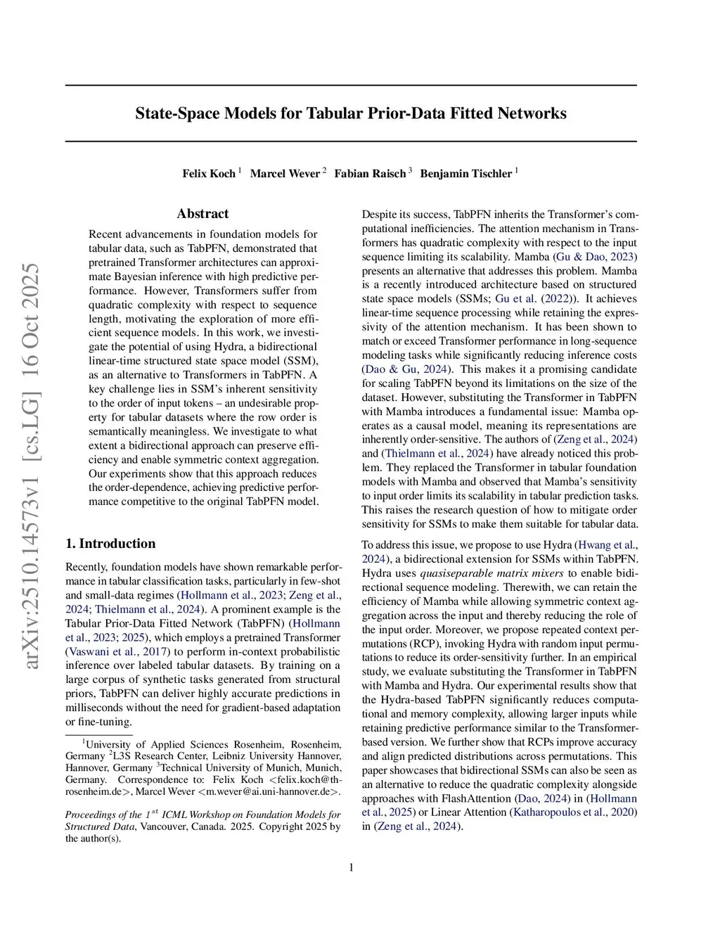 Recent advancements in foundation models for tabular data, such as TabPFN, demonstrated that pretrained Transformer architectures can approximate Bayesian inference with high predictive performance. However, Transformers suffer from quadratic complexity with respect to sequence length, motivating the exploration of more efficient sequence models. In this work, we investigate the potential of using Hydra, a bidirectional linear-time structured state space model (SSM), as an alternative to Transformers in TabPFN. A key challenge lies in SSM's inherent sensitivity to the order of input tokens - an undesirable property for tabular datasets where the row order is semantically meaningless. We investigate to what extent a bidirectional approach can preserve efficiency and enable symmetric context aggregation. Our experiments show that this approach reduces the order-dependence, achieving predictive performance competitive to the original TabPFN model.