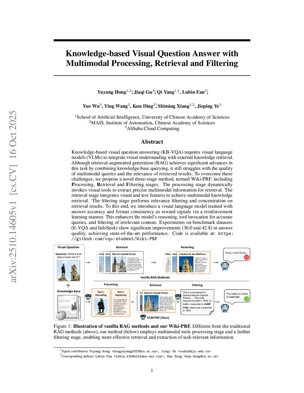Knowledge-based visual question answering (KB-VQA) requires visual language models (VLMs) to integrate visual understanding with external knowledge retrieval. Although retrieval-augmented generation (RAG) achieves significant advances in this task by combining knowledge-base querying, it still struggles with the quality of multimodal queries and the relevance of retrieved results. To overcome these challenges, we propose a novel three-stage method, termed Wiki-PRF, including Processing, Retrieval and Filtering stages. The processing stage dynamically invokes visual tools to extract precise multimodal information for retrieval. The retrieval stage integrates visual and text features to achieve multimodal knowledge retrieval. The filtering stage performs relevance filtering and concentration on retrieval results. To this end, we introduce a visual language model trained with answer accuracy and format consistency as reward signals via a reinforcement learning manner. This enhances the model's reasoning, tool invocation for accurate queries, and filtering of irrelevant content. Experiments on benchmark datasets (E-VQA and InfoSeek) show significant improvements~(36.0 and 42.8) in answer quality, achieving state-of-the-art performance. Code is available atthis https URL