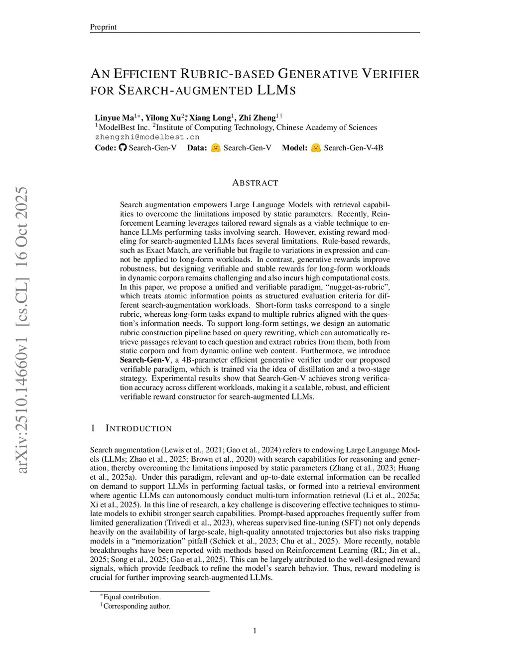 Search augmentation empowers Large Language Models with retrieval capabilities to overcome the limitations imposed by static parameters. Recently, Reinforcement Learning leverages tailored reward signals as a viable technique to enhance LLMs performing tasks involving search. However, existing reward modeling for search-augmented LLMs faces several limitations. Rule-based rewards, such as Exact Match, are verifiable but fragile to variations in expression and cannot be applied to long-form workloads. In contrast, generative rewards improve robustness, but designing verifiable and stable rewards for long-form workloads in dynamic corpora remains challenging and also incurs high computational costs. In this paper, we propose a unified and verifiable paradigm, "nugget-as-rubric", which treats atomic information points as structured evaluation criteria for different search-augmentation workloads. Short-form tasks correspond to a single rubric, whereas long-form tasks expand to multiple rubrics aligned with the question's information needs. To support long-form settings, we design an automatic rubric construction pipeline based on query rewriting, which can automatically retrieve passages relevant to each question and extract rubrics from them, both from static corpora and from dynamic online web content. Furthermore, we introduce \textbf{Search-Gen-V}, a 4B-parameter efficient generative verifier under our proposed verifiable paradigm, which is trained via the idea of distillation and a two-stage strategy. Experimental results show that Search-Gen-V achieves strong verification accuracy across different workloads, making it a scalable, robust, and efficient verifiable reward constructor for search-augmented LLMs.