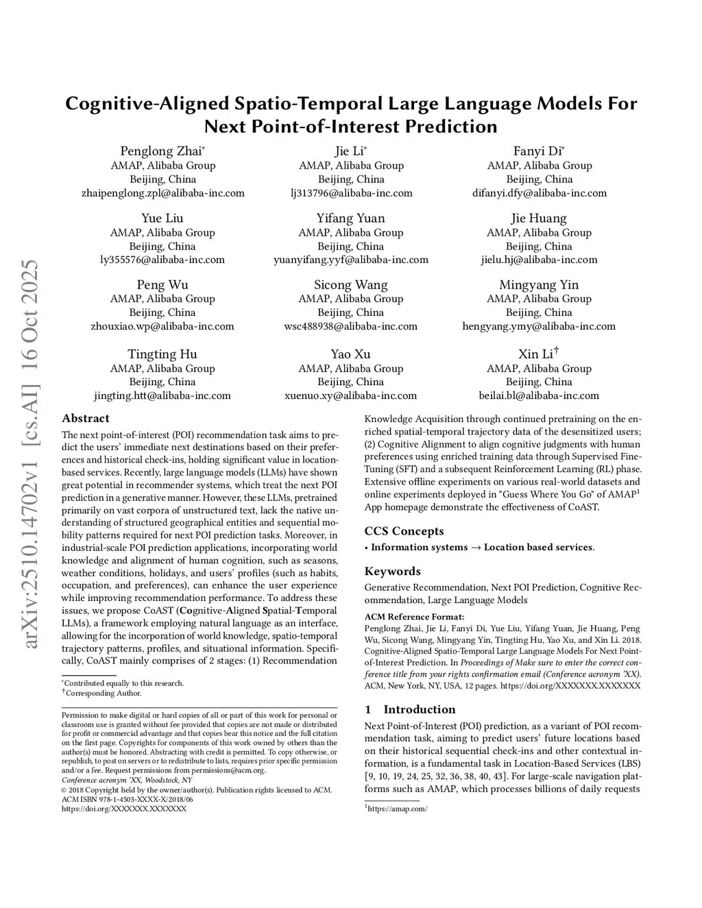 The next point-of-interest (POI) recommendation task aims to predict the users' immediate next destinations based on their preferences and historical check-ins, holding significant value in location-based services. Recently, large language models (LLMs) have shown great potential in recommender systems, which treat the next POI prediction in a generative manner. However, these LLMs, pretrained primarily on vast corpora of unstructured text, lack the native understanding of structured geographical entities and sequential mobility patterns required for next POI prediction tasks. Moreover, in industrial-scale POI prediction applications, incorporating world knowledge and alignment of human cognition, such as seasons, weather conditions, holidays, and users' profiles (such as habits, occupation, and preferences), can enhance the user experience while improving recommendation performance. To address these issues, we propose CoAST (Cognitive-Aligned Spatial-Temporal LLMs), a framework employing natural language as an interface, allowing for the incorporation of world knowledge, spatio-temporal trajectory patterns, profiles, and situational information. Specifically, CoAST mainly comprises of 2 stages: (1) Recommendation Knowledge Acquisition through continued pretraining on the enriched spatial-temporal trajectory data of the desensitized users; (2) Cognitive Alignment to align cognitive judgments with human preferences using enriched training data through Supervised Fine-Tuning (SFT) and a subsequent Reinforcement Learning (RL) phase. Extensive offline experiments on various real-world datasets and online experiments deployed in "Guess Where You Go" of AMAP App homepage demonstrate the effectiveness of CoAST.